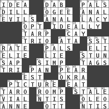 ACROSS 1. The main thing one is thinking about 5. Apply (a substance) by light strokes 8. Friends 12. Deli pickle 13. Double curve, resembling the letter S 15. Of or related to the anus 16. Vices 18. Of or related to the anus 19. Made of lace 20. Choose 22. Under perfect conditions 24. Canvas cover 26. Island 27. Musical group of three 28. "One Day ___ Time" 29. Fast jet (abbr.) 32. Assign a rank or rating to 35. Friends 37. Connecticut Ivy Leaguer 38. Writer Wiesel 39. Untruth 40. Astound 41. Plant excrement 42. Simple or foolish person 43. Labels 44. Three (prefix) 45. Baking dish 46. Lightbulb-shaped fruit 49. Eastern Standard Time (abbr.) 50. Gumbo ingredient 51. Photo 55. Consume 56. Edible starchy tuberous root 57. Frolic 59. Having lost freshness 63. Small bottle 64. Nuclear Threat Initiatives 65. Margarine 66. Queen of England 1702-14 67. Baseball player Mel 68. Nuclear Threat Initiatives DOWN 1. Binary compound 2. HTML Container Element 3. Biblical high priest 4. One to whom something is allotted 5. ___ good deed 6. Hindu god of fire 7. Necklace unit 8. Friendly 9. Of or related to the anus 10. Made of lace 11. Insidious 14. Chooses 17. Practice fight 21. Three (prefix) 23. American Automobile Association (abbr.) 25. Cotton for raincoats, e.g. 28. City in Syria 29. Stalk of a moss capsule 30. Snaillike creature with no shell 31. Canisters 32. Remainder 33. Having or resembling wings 34. Native american tent (variation) 36. Direct toward a target or goal 40. Ski resort town in Vermont 42. Titan orbits this 45. Pacific Standard Time (abbr.) 47. Supplement with great effort 48. Ancient river in northeast Turkey 49. Learning spot: Fr. 51. Ache 52. SW Asia republic 53. Printing process, for short 54. Give off 56. Federal power corp. 58. Pacific Standard Time (abbr.) 60. The first octave above the treble staff 61. Flowery wreath 62. Greek goddess of the dawn