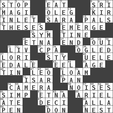 ACROSS 1. Discontinue 5. Erode 8. _ Lanka 11. Wise men 12. Cassini of fashion 14. Apertif with cassis 15. An arm off of a larger body of water 17. "Two Mules for Sister ____" 18. Friends 19. College papers 21. Develop 23. Symbol (abbr.) 25. Prong on a fork 26. Inactive volcano in Sicily 27. Conclusion 28. Fr. "Yes" 31. 54 in ancient Rome 33. Numbers guy (abbr.) 35. Stared 37. Australian parrot (variant) 38. Filthy place 40. Ubangi River tributary 41. Peak District village in England 43. Snakelike fish 45. Grow older 46. Shallow baking pan 47. Lion 50. Rich soil 52. Astrian river, tributary to the Danube 53. Baking dish 54. Device for capturing images 56. Annoying sounds 61. Simple or foolish person 62. Inactive volcano in Sicily 65. Satellite of Uranus 66. Had dinner 67. Tenth: prefix 68. Silent film actress Nazimova 69. Writing instrument 70. Spanish title 71. Egg locale DOWN 1. Stricken, poetically 2. Hyperbolic tangent 3. Stare 4. Sliced desserts 5. Greek goddess of the dawn 6. According to 7. Cylindrical with tapered ends 8. Heroin 9. Cause heat under the collar 10. Big collection agency 13. Street urchin 16. Trial 18. Before (prefix) 20. Synchronize (abbr.) 22. Inside; within (prefix) 24. Atlas contents 26. Morally bad or wrong 28. Cassini of fashion 29. Ubangi River tributary 30. Binary compound 31. Farming town in central California 32. SW Asia republic 34. Had dinner 36. Island territory of the United States 37. Allow 39. Sharp bark 42. Otherwise 44. Grant temporary use of 48. Having ears or earlike features 49. Declaimed 51. Small Philippine buffalo 52. Naughty child 54. Quote 55. So be it 57. SW Asia republic 58. Drop; flow; fall 59. Snakelike fish 60. Narrow board 61. Plant excrement 63. Non-commissioned officer (abbr.) 64. The 18th letter of the Arabic alphabet