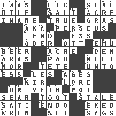 ACROSS 1. It was, poetically 5. And so on (abbr.) 8. Lick closed 12. Cause heat under the collar 13. Table seasoning 15. Land measure 16. Silly 18. Loyal 19. Pate de foie ____ 20. Alias (abbr.) 22. Son of Zeus who helped slay Medusa 24. Look after 26. Curvy letter 27. River in Europe 28. Baseball player Mel 29. Australian flightless bird 32. Fermented drink made from hops 35. Measure of real estate 37. Lair 38. Caspian sea tributary 39. Groovy apt. 40. Confront 41. Or not 42. False hair 43. To (old English) 44. Curvy letter 45. French article 46. Eons 49. Apertif with cassis 50. Old wives' tales, e.g. 51. Popular '50s hangout 55. Cooking vessel 56. Dry up 57. A blast of a horn 59. Showing deterioration from age 63. Suttee (variant) 64. Inside; within (prefix) 65. Supplemented with great effort 66. Songbird 67. Put into a specified state 68. Droops DOWN 1. Three (prefix) 2. Victory 3. In the manner of 4. Legislators 5. Eastern Standard Time (abbr.) 6. Canvas cover 7. A slight indication 8. Gurus 9. Shade of tan 10. Ancient river in northeast Turkey 11. French article 14. Cylindrical with tapered ends 17. Supplemented with great effort 21. A saturated hydrocarbon 23. Fast jet (abbr.) 25. Window treatments 28. Severe or trying experience 29. Paradise 30. Rendezvous 31. To (old English) 32. Object of repulsion 33. Greek god of love 34. Hearing organs 36. Domesticated feline 40. French bagpipes 42. Cigar-shaped 45. 54 in ancient Rome 47. Republican Party 48. Greek god of love 49. Japanese brewing company 51. Letter starter 52. Assign a rank or rating to 53. Charged atoms 54. Thickened enlargement 56. Compass dir. 58. Small child 60. Alias (abbr.) 61. Part of a journey 62. Begley and Asner