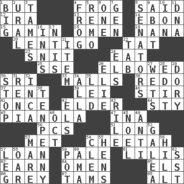 ACROSS 1. With the exception that 4. Toadlike animal 8. Expressed in words 12. Lyricist Gershwin 13. French philosopher Descartes 14. Inky black, to poets 15. Homeless child 18. Sign of things to come 19. Grandmother 20. Small, flat, pigmented spot on the skin 22. Make lace 23. In a ____ (agitated or irritated) 24. Consume 25. Compass dir. 26. Shoved, as through a crowd 30. _ Lanka 33. Promenades 36. Do over again 37. Portable shelter 39. Luau accessory 40. Commotion 41. Single time 42. A person who is older than you are 44. Filthy place 45. Player piano 47. _ tizzy (2 wds.) 50. Personal Computers (abbr.) 51. Protracted 53. Was introduced to 54. Leopard's kin 57. Grant temporary use of 59. Light colored 61. Ms. Damita and namesakes 63. Merit 64. Sign of things to come 65. Raised railways 66. Jennifer or Joel 67. Scottish caps 68. Keyboard modifier key DOWN 1. Large 2. Mountain range 3. Makes less strong or intense 4. Tree-dwelling hopper 5. San ____ (Riviera town) 6. Single 7. Commissioned military rank (abbr.) 8. Elected representatives 9. Blind as ____ 10. Electrically charged atom 11. Heredity factor (abbr.) 16. Lodging establishments 17. Nuclear Threat Initiatives 21. A whole individual unit 22. Bar bill 24. Raised railways 26. Writer Wiesel 27. Soaks 28. Prepare for publication 29. Small, narrow, flatbottom fishing boat 30. Constrict 31. Painter Guido (1575-1642) 32. South American Indian 34. Silent film actress Nazimova 35. Directed 38. 3-inch nail 42. Raised railways 43. Cause heat under the collar 46. Sep. follower 48. Christmas carol 49. Against 52. An organ shaped like a helmet 53. Female horse 54. To starve (Brit.) 55. Coop moms 56. Land elevation 57. Part of a journey 58. Rowing implement 59. Cooking vessel 60. Housemaid (var.) 62. Fast jet (abbr.)
