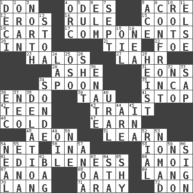 ACROSS 1. Spanish title 4. Lyric poems 8. Land measure 12. Greek god of love 14. General guideline 15. Calm and collected 16. Heavy open wagon 17. Pieces 20. To the inside or interior of 21. Standoff 22. Enemy 23. Saint headwear 27. Cowardly lion portrayer 29. American tennis player Robert 31. Immeasurably long periods of time 34. Soup utensil 35. South American Indian 36. Inside; within (prefix) 39. The 19th letter of the Greek alphabet 41. Halt 42. Adolescent 43. Distinguishing feature 46. Chilled 47. Merit 48. Age 51. Memorize 54. Fish or hair follower 56. _ tizzy (2 wds.) 58. Charged atoms 61. The property of being fit to eat 66. Mine, in Marseilles 67. Small Philippine buffalo 68. Pledge 69. Austrian-born American filmmaker Fritz 70. Austrian-born American filmmaker Fritz 71. Like ___ of sunshine 72. Spanish title DOWN 1. Tenth: prefix 2. Northwest Algerian city 3. _ pole 4. The grampus (Milton) 5. Superhero pair 6. Shade tree 7. Back-to-school mo. 8. Adept person 9. Meet 10. Printing process, for short 11. Otherwise 13. Portico 18. Lubricate 19. Teachers' org. 24. Pet locale 25. Bear (Spanish) 26. Went for two points 28. Robbery 30. Related on the mother's side 32. Non-commissioned officer (abbr.) 33. Plant excrement 34. Something which is sent 36. And so on (abbr.) 37. Modern: prefix 38. Accusation by an informer 40. Mountain range 44. "We ___ not amused" (Victoria) 45. _ tizzy (2 wds.) 49. Lubricate 50. Compass dir. 52. Monetary unit of Yemen 53. Roamer 54. Anneal 55. Pulitzer Prize-winning author Ferber 57. Small Philippine buffalo 59. Words to Nanette 60. Attach a signature 62. Paper or plastic container 63. Ewer handle 64. R.R. building 65. Like a shrinking violet