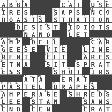 ACROSS 1. Swedish rock group 5. Domesticated feline 8. Purpose 11. Angers 12. Plant excrements 13. Non-commissioned officer (abbr.) 14. Cooks with dry heat, as in an oven 17. Ski resort town in Vermont 19. Stop 21. Foolish or stupid persons 22. Billionth: prefix 23. Allow 24. Electrical Unit 27. Small valley 29. 4-wheeled motor vehicle 32. Honkers 34. Compete 36. Actor's bit 37. Monthly bill 38. Connecticut Ivy Leaguer 39. Ancient Greek god of war 40. Inactive volcano in Sicily 41. Be seated 42. Small fatty European fish 43. Double-curved letter 44. Attempt 46. Big collection agency 47. _ moment's notice (2 wds.) 50. Part of Q.E.F. 52. Soft color 55. Window treatments 57. Electrical Measurement 59. Fragments 62. Area sheltered from the wind 63. Comedian Laurel of Laurel & Hardy 64. Without 65. Conclude 66. Car or cant ending 67. Part of Q.E.F. DOWN 1. Wind 2. Sis' sibling 3. Necklace unit 4. NE Netherlands city 5. Feline 6. Showery time 7. Sadhe (variant) 8. To (old English) 9. Highlander 10. Immeasurably long periods of time 12. Fast jet (abbr.) 15. Sadhe (variant) 16. Trig term 18. Teat (slang) 20. Finds the solution 24. Match 25. Confronts 26. Actor Sean's family 28. Ms. Damita and namesakes 29. High-altitude cloud 30. Approach 31. Musical pauses 33. R.R. building 35. One or the other 36. Pet locale 42. Staphylococcus 45. Mouths or openings 47. Had dinner 48. Laconic 49. Having winglike extensions 51. Laconic 52. Diluted with white 53. So be it 54. Drove too fast 55. Lair 56. Wither 58. Separate the seeds from cotton 60. Heredity factor (abbr.) 61. Fast jet (abbr.)