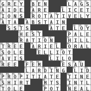 ACROSS 1. Jennifer or Joel 5. Benjamin's nick name 8. Fails to keep up a pace 12. Assistant 13. "We ___ not amused" (Victoria) 14. It is permitted: Lat. 15. Charged particles 16. Producing rotation 19. "One Day ___ Time" 20. Refrain by choice 21. Fast planes 23. Had dinner 24. Myrna of the movies 27. Command 30. Diluted with white 31. Food allowance for one day 34. Land elevation 35. Relationship diagram 38. Satellite of Uranus 40. Taken by mouth 41. Flatfish 42. American author Paul (1891-1958) 44. Advice 45. _ and Stitch 46. Portuguese money of account (variant) 47. Opposite of masc. 50. He sold his birthright 53. Preparing or cooking with lard 57. Hat (slang) 59. Appease 63. Prong on a fork 64. Upper-body garment 65. Mountains (abbr.) 66. International (abbr.) 67. Lacquered or enameled metalware 68. Cooking vessel 69. Actress Patricia DOWN 1. Greek goddess of the earth (variant) 2. Debaucheries 3. Ferber et al. 4. Affirmative reply 5. Sharp remark 6. Greek god of love 7. Remaining after all deductions 8. 54 in ancient Rome 9. Adept person 10. Set 11. Filthy place 14. Actor's bit 17. Auto club (abbr.) 18. Teat (slang) 20. At sea 22. Triads 24. Den 25. Spanish pot 26. Shout 28. R.R. building 29. Hoop that covers a wheel 30. Pictures 32. Petroleum 33. 1994 drama film starring Jodie Foster 35. Russian ruler of old 36. Be footloose 37. Writer Wiesel 39. Cards in a Roman deck? 43. Cassini of fashion 47. Sudden quick movement 48. Consume 49. Medical imaging device (abbr.) 51. Place in a line 52. National forest in Provo, Utah 54. Moist 55. "Tell ____ the Marines!" 56. A home for chicks 58. Small valley 59. Pacific Standard Time (abbr.) 60. 17th letter of the Greek alphabet 61. Lubricate 62. Before (prefix) 63. Shallow baking pan