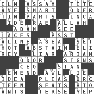 ACROSS 1. Shade tree 4. Indian state 9. Wig 13. "___ Maria" 14. Don Adams' spy role 15. Baltic tributary 16. Metal container 17. Pieces 18. South American Indian 19. Binary compound 21. Actress Charlotte 22. Assad's deity 24. First man 26. Perceive with the eye 27. Shoestrings 29. Inconspicuous attention getter 30. Place in a line 31. Toward the sea 33. Arrange properly for use 36. Being at a high temperature 37. Refrain by choice 40. Biblical high priest 41. Marina Del _, California 42. One who doesn't tell the truth 43. Believer in; advocate of (suffix) 45. Scent 47. Attaches a signature 48. Corporate head (abbr.) 49. Comedian Laurel of Laurel & Hardy 50. Make improvements or corrections to 52. Leather borer 54. Whopper 56. The content of cognition 57. Entreaties 59. The grampus (Milton) 61. Adolescent 62. Theater features 63. _ de Janeiro 64. Pismires 65. Laconic 66. Slangy assent DOWN 1. Erode 2. 57 in ancient Rome 3. Ananias' fault 4. Viper 5. Excessive but superficial compliments 6. "Two Mules for Sister ____" 7. Johnson of "Laugh-In" 8. Mountains (abbr.) 9. Rest room 10. Pulitzer Prize-winning author Ferber 11. Georgia ____ (Atlanta school) 12. Epoch 20. Paradise 22. Slender Brazilian palm 23. French article 25. At sea 27. Cowardly lion portrayer 28. Medicinal plant 29. Lightbulb-shaped fruit 31. SW Saudi Arabia district 32. R.R. building 33. Signiory (variant) 34. Style 35. Metal containers 38. Vital fluid 39. Political cartoonist Thomas 44. Monetary unit of Yemen 45. Seas 46. Lair 49. Narrow boards 50. Locale of original sin 51. Rendezvous 52. Toward shelter 53. Put on (as clothing) 55. One of the Great Lakes 56. Call ___ day 57. Pacific Standard Time (abbr.) 58. Compass dir. 60. Police officer (slang)