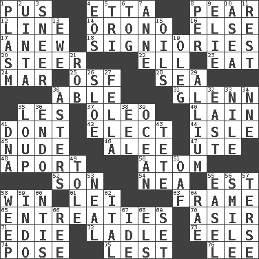 ACROSS 1. Purulenc 4. Singer James 8. Lightbulb-shaped fruit 12. Actor's bit 14. U. of Maine site 16. Otherwise 17. Afresh 18. Seigniories (variant) 20. Bull 22. Pipe bend 23. Ingest 24. Make imperfect 25. Order of Saint Francis (abbr.) 28. Ocean 30. Competent 31. American astronaut and politician John 35. French article 37. Margarine 40. (Had) reclined 41. Do not 42. Opt 44. Capri or Wright 45. Naked 46. Toward shelter 47. Shoshoni 48. To the left, to Queeg 50. Smallest unit of an element 52. Manchild 54. Teachers' org. 55. Eastern Standard Time (abbr.) 58. Acquire through effort 61. Flowery wreath 63. Movie unit 65. Pleas 70. SW Saudi Arabia district 71. Singer Brickell 72. Dipping utensil 73. Snakelike fish 74. Introduce or present, as a question 75. For fear that 76. Area sheltered from the wind DOWN 1. Suffix with ecto or cyto 2. National forest in Provo, Utah 3. Scornful expression 4. Greek goddess of the dawn 5. Three (prefix) 6. Coat; cloak 7. Queen of England 1702-14 8. For each 9. Writer Wiesel 10. At sea 11. Relief 13. She-sheep 15. Petroleums 19. Cassini of fashion 21. Director Reiner 26. A type of plum 27. Chap (slang) 29. Plant genus of onion and garlic 30. Michaelmas daisies 32. Compass direction 33. Mediterranean tributary 34. Compass dir. 35. Central Nebraska county 36. Inside; within (prefix) 38. Snakelike fish 39. Sea 41. Heredity factor (abbr.) 43. False hair 49. Lacquered or enameled metalware 51. Clumsy lout 53. Be tempered by heat 55. Artist's stand 56. Grin 57. Laconic 58. Shed a tear 59. Southeast Asian peninsula 60. Nuclear Threat Initiatives 62. Slanted text style (abbr.) 64. Actress Charlotte 66. To separate or throw off 67. Binary compound 68. Raised railways 69. Arrange properly for use