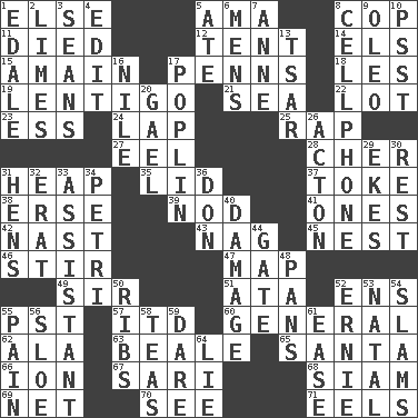 ACROSS 1. Otherwise 5. Housemaid (var.) 8. Police officer (slang) 11. Passed on 12. Portable shelter 14. Raised railways 15. With great haste 17. Actor Sean's family 18. French article 19. Small, flat, pigmented spot on the skin 21. Ocean 22. Car dealer's back yard 23. Curvy letter 24. Infant locale 25. Strike 27. Snakelike fish 28. "Mermaids" star 31. Pile 35. Hat (slang) 37. Casino tip 38. Celtic language 39. Allow head to fall sleepily 41. Singles 42. Political cartoonist Thomas 43. Tired old horse 45. A home for chicks 46. Commotion 47. Atlas unit 49. Title for a knight 51. _ moment's notice (2 wds.) 52. Followers of ems 55. Pacific Standard Time (abbr.) 57. It would 60. Commissioned military rank 62. Chicken ___ king 63. Calif. Air Force Base 65. Before Barbara or Clara 66. Electrically charged atom 67. Indian skirt 68. Thailand, formerly 69. Fish or hair follower 70. Perceive with the eye 71. Snakelike fish DOWN 1. Peak District village in England 2. Citrus fruits 3. Actors Connery and Penn 4. Prepare for publication 5. Had dinner 6. Not women's 7. Queen of England 1702-14 8. Portable communications device 9. Margarine 10. Inconspicuous attention getter 13. Russian ruler of old 16. "Death on the ____" 17. Cotton for raincoats, e.g. 20. Highlander 26. 13-14th century defensive garment 29. Supplements with great effort 30. Relief 31. Coop moms 32. Part of Q.E.F. 33. Helper 34. _ dish (used to culture cells) 36. Spanish title 40. Break 44. Yard entry 48. Baking dishes 50. Teases 52. Bert's buddy 53. Relating to or accompanying birth 54. Hits or strikes with great force 55. Ache 56. _ gin 58. Afternoon social gatherings 59. Have the gumption 61. Relaxation 64. Whopper