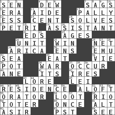 ACROSS 1. Elected rep. 4. Morning condensation 7. Settles 11. Period 12. Assistant 13. Chummy 14. Double-curved letter 15. Penny 16. Finds the solution 17. _ dish (used to culture cells) 19. Aide 21. Begley and Asner 23. Ripens 24. A single undivided whole 25. Acquire through effort 26. Fish or hair follower 29. N. Chile seaport 30. Followers of ems 31. Australian flightless bird 32. Ocean 33. Ingest 34. Compete 35. Plant holder 36. Armed conflict 37. Come to pass 40. One (Scot) 41. ___ a Wonderful Life 42. Angers 43. Old wives' tales, e.g. 45. Flowery wreath 46. Dwelling 51. Upward 55. Speaker 56. Spoils 58. _ de Janeiro 59. Carrier 60. Single time 61. The first octave above the treble staff 62. SW Saudi Arabia district 63. Pacific Standard Time (abbr.) 64. Observe DOWN 1. Ooze 2. Celtic language 3. Political cartoonist Thomas 4. Pass on 5. Pulitzer Prize-winning author Ferber 6. Moistens 7. Table seasonings 8. Inventor's middle name 9. Small, secluded valley 10. System (abbr.) 12. Being or containing an acid 13. Airs 16. Signals 18. Painter Guido (1575-1642) 20. Virtuous person 22. R.R. building 24. A salt of uric acid 25. Erodes 26. Congenital growth or mark on the skin 27. Arab leader 28. Third day of the wk. 29. A really long time 32. Health resort 33. Ingested 36. One who wires 37. Petroleum 38. Cause to be 39. To provide with a ceiling 43. 61 cubic inches 44. Scent 46. Roll call or roster of names 47. Greek god of love 48. Suttee (variant) 49. Hoof sound 50. Immeasurably long periods of time 52. Mouths or openings 53. Do some clerical work 54. Lug 57. Sep. follower