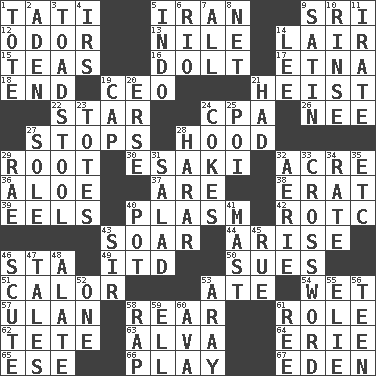 ACROSS 1. Jacques of French films 5. SW Asia republic 9. Indian title of respect (Mr.) 12. Aroma 13. The longest river in the world 14. Den 15. Beverages made from leaves 16. Dunce 17. Inactive volcano in Sicily 18. Conclusion 19. Corporate head (abbr.) 21. Robbery 22. Play the lead 24. Numbers guy (abbr.) 26. Born 27. Halts 28. Parka part 29. Carrot, for example 30. 1973 Nobel Price Winner (Physics) Leo 32. Land measure 36. Medicinal plant 37. "We ___ not amused" (Victoria) 38. Part of Q.E.F. 39. Snakelike fish 40. Suffix with ecto or cyto 42. College mil. group 43. Fly high 44. Get up 46. R.R. building 49. It would 50. Takes to court 51. Bodily heat indicating an inflammation 53. Had dinner 54. Soggy 57. ____ Bator 58. Stern 61. Hero or heavy, e.g. 62. False hair 63. Inventor's middle name 64. One of the Great Lakes 65. Compass dir. 66. Romp 67. Locale of original sin DOWN 1. Carry 2. An important port of Yemen 3. Inedible or poisonous agaric 4. Big collection agency 5. Southeast Asian peninsula 6. _ de Janeiro 7. 100% 8. Fish or hair follower 9. Smooth fabric 10. Wash lightly 11. Feeling or showing extreme anger 14. Area sheltered from the wind 19. Head covering 20. Celtic language 21. Possessed 23. Lugs 24. Popular sodas 25. Luau course 27. Flatfish 28. Ethiopian city, capital of Harari 29. Actress Charlotte 31. First course 32. Nest on high 33. What you're doing now 34. Assign a rank or rating to 35. And so on (abbr.) 40. Cooking vessel 41. Vertical spar for supporting sails 43. Title for a knight 45. Sorrow 46. Scutum 47. Lies 48. Having winglike extensions 52. Single 53. Like ___ of sunshine 55. Writer Wiesel 56. Adolescent 58. Hit sharply and swiftly 59. Pipe bend 60. Actress Gardner 61. To sift