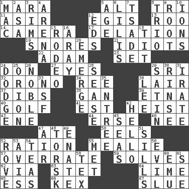 ACROSS 1. Hindu Mythology: god of death 5. The first octave above the treble staff 8. Three (prefix) 11. SW Saudi Arabia district 12. The front part of a cuirass 13. Friend of Pooh 14. Device for capturing images 17. Conveyance 19. Sounds asleep 21. Foolish or stupid persons 22. First of billions? 23. Arrange properly for use 24. Spanish title 27. Snake ____ (dice throw) 29. _ Lanka 32. U. of Maine site 34. Portuguese money of account (variant) 36. Den 37. Rights 38. Separate the seeds from cotton 39. Inactive volcano in Sicily 40. Eighteen holes 41. Eastern Standard Time (abbr.) 42. Robbery 43. Compass dir. 44. Celtic language 46. Born 47. Had dinner 50. Snakelike fish 52. Food allowance for one day 55. Ear of corn 57. Make much ado about nothing 59. Finds the solution 62. By way of 63. Proofreading order 64. Welles in "The Third Man" 65. Curvy letter 66. A weed 67. Change direction abruptly DOWN 1. Apple computer (short form) 2. White ___ sheet 3. Basketball hoops 4. Sports stadium 5. Mature 6. Ms. Damita and namesakes 7. Sadhe (variant) 8. Musical group of three 9. Carrot, for example 10. Charged particles 12. Begley and Asner 15. Cowboy competition 16. Like ___ of sunshine 18. Teat (slang) 20. Develop 24. Evade 25. Greek mythologigal hunter 26. Having high moral qualities 28. Gospel singer Marvin 29. Smooth fabric 30. Wash lightly 31. Feeling or showing extreme anger 33. Overdraft (abbr.) 35. Main course 36. Area sheltered from the wind 42. Phone greeting 45. Oceans 47. Wind 48. Cod relative 49. Related on the mother's side 51. Beverly of Met fame 52. Be footloose 53. Deliberation 54. Afternoon social gatherings 55. Was introduced to 56. Tending to cause great harm 58. John Ritter's dad 60. Australian flightless bird 61. Perceive with the eye