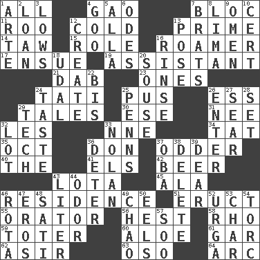 ACROSS 1. 100% 4. E Mali city 7. Coalition 11. Friend of Pooh 12. Lacking warmth 13. First class 14. The 23rd letter of the Hebrew alphabet 15. Hero or heavy, e.g. 16. Wanderer 17. Take place subsequently 19. Helper 21. Apply (a substance) by light strokes 23. Washington bills 24. Jacques of French films 25. Fluid product of inflammation 26. Curvy letter 29. Lies 30. Compass dir. 31. Born 32. French article 33. Compass dir. 34. Make lace 35. Sep. follower 36. Spanish title 37. More peculiar 40. Definite Article 41. Raised railways 42. Fermented drink made from hops 43. Globular water bottle used in Asia 45. Insect wing 46. Home 51. Spew [out] 55. Speaker 56. Command 58. 17th letter of the Greek alphabet 59. Carrier 60. Medicinal plant 61. Slender fish 62. SW Saudi Arabia district 63. Bear (Spanish) 64. Curve DOWN 1. Johnson of "Laugh-In" 2. Grant temporary use of 3. Moos 4. Thick or sticky substance 5. Silent film actress Nazimova 6. Lyric poems 7. Naughty children 8. Pale green bean 9. Sign of something about to happen 10. An absolute certainty 12. Cause to be 13. Airs 16. Wash lightly 18. Freehold land 20. Boozer 22. Twice 24. Clothes sense 25. Actor Sean's family 26. Keyboard key 27. Burn superficially 28. Put into a specified state 29. Georgia ____ (Atlanta school) 32. Car dealer's back yard 33. Pitcher Ryan 36. Prevent from occurring 37. Chief or king in Benin or Nigeria 38. Keyboard key 39. Letter starter 43. 61 cubic inches 44. Scent 46. Roll call or roster of names 47. Greek god of love 48. Suttee (variant) 49. US Secretary of Labor Elaine L. _ 50. Snakelike fish 52. Capital and largest city of Mongolia 53. Burn to charcoal 54. Torque (variant) 57. "Barney Miller" actor Jack