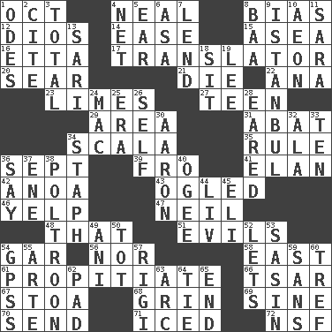 ACROSS 1. Sep. follower 4. Be tempered by heat 8. Prejudice 12. "Vaya con ____" 14. Relaxation 15. At sea 16. Singer James 17. Interpreter 20. Singe 21. Expire 22. Santa ___, CA 23. Citrus fruits 27. Adolescent 29. Length times width 31. Blind as ____ 34. Any of the three canals of the cochlea 35. Court order 36. Back-to-school mo. 39. Away 41. Liveliness 42. Small Philippine buffalo 43. Stared 46. Sharp bark 47. Famous astronaut Armstrong 48. Not this but _ 51. Vices 54. Slender fish 56. Not either 58. Compass direction 61. Appease 66. Russian ruler of old 67. Portico 68. Broad smile 69. Trig term 70. Post 71. On the rocks 72. Science/research agcy. DOWN 1. Lyric poems 2. Quote 3. Add up to 4. Fish or hair follower 5. Hearing organ 6. White ___ sheet 7. Grant temporary use of 8. Sound made by sheep 9. Byzantium, centuries later 10. A really long time 11. "Two Mules for Sister ____" 13. Indian skirt 18. Be seated 19. Area sheltered from the wind 24. Big _ 25. Period 26. Automatic 28. Having ears or earlike features 30. Composer Copland 32. Chicken ___ king 33. Nine, plus one 34. Staphylococcus 36. Declare 37. Compass dir. 38. Characterized by complete cowardliness 40. Double curve, resembling the letter S 44. 54 in ancient Rome 45. Connecticut Ivy Leaguer 49. Black tropical American cuckoo 50. Small child 52. Allows 53. Indian antelope 54. Global Positioning Systems (abbr.) 55. Johnson of "Laugh-In" 57. Swiss mountan, "Queen of the Mountains" 59. Without 60. Not kosher 62. Groovy apt. 63. Curve 64. Standoff 65. Conclude
