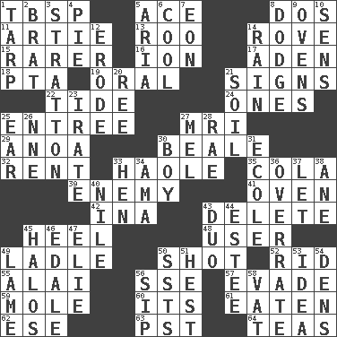 ACROSS 1. Cook's measure (abbr.) 5. Adept person 8. Two (Sp.) 11. Nick name for Arthur 13. Friend of Pooh 14. Be footloose 15. Less widely known 16. Electrically charged atom 17. An important port of Yemen 18. Parent Teacher Assoc. 19. Of the mouth 21. Omens 22. Event that recurs at intervals 24. Singles 25. Main course 27. Medical imaging device (abbr.) 29. Small Philippine buffalo 30. Memphis, Tenn. Street 32. Monthly bill 33. White Person, in Hawaii 35. Root beer relative 39. Foe 41. Baking chamber 42. _ tizzy (2 wds.) 43. Erase 45. The bottom of a shoe or boot 48. One who uses or employs something 49. Dipping utensil 50. Opportunity 52. To free from 55. Jai ____ 56. Compass dir. 57. Dodge 59. Undercover agent 60. It is 61. Ingested 62. Compass dir. 63. Pacific Standard Time (abbr.) 64. Beverages made from leaves DOWN 1. Canvas cover 2. Naughty child 3. Ski resort town in Vermont 4. Sliced dessert 5. Operatic vocal solo 6. Calm and collected 7. A really long time 8. Evade 9. Baking chambers 10. Elected reps. 12. Wear away 14. Water falling in drops from the sky 20. To sift 21. Earth 23. Feeling or showing extreme anger 25. Ewer handle 26. Compass dir. 27. Cartoonist voice _ Blanc 28. Actress Charlotte 30. Male child 31. Learning spot: Fr. 33. Layer 34. Nanny (var.) 36. Make much ado about nothing 37. Allow 38. A saturated hydrocarbon 40. Mediterranean tributary 43. Superhero pair 44. First name in cosmetics 45. Rings 46. Peak District village in England 47. Writer Wiesel 49. Unable to walk 50. Fast planes 51. Command 53. The content of cognition 54. Cub Scout units 56. Small drink 58. Large container
