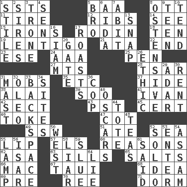 ACROSS 1. Fast planes 5. Sound made by sheep 8. Baseball player Mel 11. Become fatigued 12. Chest bones 14. Perceive with the eye 15. Removes the wrinkles 17. "The Thinker" sculptor 18. "___ Little Indians" 19. Small, flat, pigmented spot on the skin 21. "One Day ___ Time" 22. Conclude 23. Compass dir. 24. Auto club (abbr.) 25. Animal enclosure 27. Mountains (abbr.) 28. Russian ruler of old 31. Crowds into 35. And so on (abbr.) 37. Flintstone garb 38. Mountain range southwest of Kyrgyzstan 39. "Barney Miller" actor Jack 41. _ the terrible 42. Religious group 43. Pacific Standard Time (abbr.) 45. Certainty 46. Puff or smoke 47. Small bed 49. Compass dir. 51. Had dinner 52. Ocean 55. Mouth edge 57. Raised railways 60. Thinks logically 62. White ___ sheet 63. Beverly of Met fame 65. Table seasonings 66. Big _ 67. "Change" in Tahitian 68. The content of cognition 69. Before (prefix) 70. To separate or throw off 71. Dormintory (informal) DOWN 1. Vertical member of a panel or frame 2. Titles for men of rank and authority 3. Heavy duty weighing machine 4. Transmitted 5. Sis' sibling 6. Opera by Verdi 7. "This won't hurt ____!" 8. Clearly or manifestly demonstrative 9. Adolescent 10. Be inclined (to) 13. Fastener 16. Thailand, formerly 17. Ridicules or criticizes harshly 20. Yard entry 26. Principle of right and wrong 29. The sixth month of the Jewish calendar 30. Monthly bill 31. Vertical spar for supporting sails 32. Margarine 33. Keyboard key 34. Locates 36. Police officer (slang) 40. Motion picture awards 44. Lug 48. Beverages made from leaves 50. 270 degrees 52. Twentieth part of a lira 53. Keyboard key 54. Indian state 55. Desk light 56. Astrian river, tributary to the Danube 58. One who doesn't tell the truth 59. Change direction abruptly 61. Stated 64. Untruth