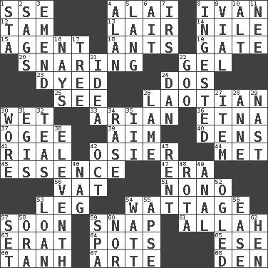 ACROSS 1. Compass dir. 4. Jai _ 8. _ the terrible 12. Scottish cap 13. Den 14. Mediterranean tributary 15. Rep 18. Pismires 19. Yard entry 20. Catching in a trap 22. Set 23. Colored 24. Two (Sp.) 25. Observe 26. Of or relating to Laos or its people 30. Dripping 33. Believer in; advocate of (suffix) 36. Inactive volcano in Sicily 37. Double curve, resembling the letter S 39. Direct toward a target or goal 40. Cub Scout units 41. Monetary unit of Yemen 42. Flexible twig of a willow tree 44. Was introduced to 45. Substance 47. Epoch 50. Large container 51. Words to Nanette 53. Part of a journey 54. Electrical Measurement 57. Within a short period 59. Fastener 61. Assad's deity 63. Part of Q.E.F. 64. Cooking vessels 65. Compass dir. 66. Hyperbolic tangent 67. Johnson of "Laugh-In" 68. Lair DOWN 1. R.R. building 2. Settles 3. Make improvements or corrections to 4. ____ Jay Lerner 5. Long (Scottish) 6. Small island 7. Big collection agency 8. Swallowed 9. Small bottle 10. Keyboard modifier key 11. Born 16. Negative votes 17. Family _ (genealogy) 21. The main thing one is thinking about 22. Thick or sticky substance 24. Daniel's nick name 26. Unable to walk 27. A distinct part 28. Queen of England 1702-14 29. Political cartoonist Thomas 30. Had on 31. Armor plate that protects the chest 32. Beverages made from leaves 34. Raze (variant) 35. One more than two 38. Veterans Day date 42. Sep. follower 43. Monthly bill 46. Tired old horse 48. Round or rotation of duties 49. Of or related to the anus 52. Stared 53. Grant temporary use of 54. Electrical Unit 55. Domed church section 56. Relaxation 57. Arrange properly for use 58. Mouth or opening 59. Health resort 60. And not 62. Layer