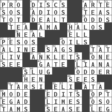 ACROSS 1. Adept person 4. Flat circles 9. Johnson of "Laugh-In" 13. Distress signal 14. Goodbye (Sp.) 15. Beverages made from leaves 16. Small child 17. Started a card game 18. Likelihood 19. Beverage made from leaves 21. Wet nurse (var.) 22. Saint headwear 24. Be tempered by heat 26. Pipe bend 27. Mexican monetary units 29. Lubricates 30. Place in a line 31. Droops 33. Make lace 36. 54 in ancient Rome 37. Short socks 40. Single 41. Perceive with the eye 42. Yard entry 43. Woody, climbing, usually tropical plant 45. Snaillike creature with no shell 47. More peculiar 48. Layer 49. Observes 50. Tarsus (plural) 52. Biblical high priest 54. _ moment's notice (2 wds.) 56. Method 57. Proofreads 59. Elect 61. Mild oath 62. Citrus fruits 63. Bear (Spanish) 64. Scottish caps 65. Gospel singer Marvin 66. Part of a journey DOWN 1. Pacific Standard Time (abbr.) 2. Carrot, for example 3. Clearly or manifestly demonstrative 4. Male parent 5. Perfect 6. Thailand, formerly 7. Root beer relative 8. Fast jet (abbr.) 9. Ringlike coral islands and reefs 10. Make new 11. Small amounts or degrees 12. Curvy letter 20. A really long time 22. Robbery 23. 100% 25. At sea 27. Friends 28. Writer Wiesel 29. Double curve, resembling the letter S 31. Heroin 32. Keyboard modifier key 33. Inedible or poisonous agaric 34. Singer Murray 35. Pull apart 38. Group of southern Bantu languages 39. A type of plum 44. The content of cognition 45. Tears up 46. French article 49. Settings 50. Ancient Roman robe 51. First of billions? 52. Singer Brickell 53. Pale green bean 55. Domed church section 56. Was introduced to 57. Raised railways 58. Compass dir. 60. Coat; cloak