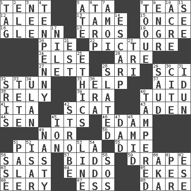 ACROSS 1. Portable shelter 5. _ moment's notice (2 wds.) 8. Afternoon social gatherings 12. Toward shelter 13. Not wild 15. Single time 16. American astronaut and politician John 18. Greek god of love 19. Legendary monster 20. Sliced dessert 22. Photo 24. Otherwise 26. "We ___ not amused" (Victoria) 27. Remaining after all deductions 28. Indian title of respect (Mr.) 29. _-fi 32. Surprise greatly 35. Assist 37. Assist 38. Have trust in 39. Lyricist Gershwin 40. Ballerina skirt 41. Call ___ day 42. Get outta here! 43. An important port of Yemen 44. Elected rep. 45. It is 46. Dutch treat 49. Not either 50. Moist 51. Player piano 55. Expire 56. Backtalk 57. Auction offers 59. Window treatment 63. Narrow board 64. Inside; within (prefix) 65. Makes supply last 66. Suggestive of the supernatural 67. Curvy letter 68. Have the gumption DOWN 1. Label 2. Pipe bend 3. Born 4. 3-inch nail 5. Had dinner 6. Canvas cover 7. Mine, in Marseilles 8. Woman's close-fitting hat 9. Engineer (abbr.) 10. 1/640 square mile 11. Perceive with the eye 14. Fortification 17. "Death on the ____" 21. Eastern Standard Time (abbr.) 23. Three (prefix) 25. Principles of right and wrong 28. Scheduled 29. Saudi Arabian king (1953-1964) 30. Quote 31. Goddess of spring and wife of Bragi 32. Indian titles of respect 33. False hair 34. ____ Bator, Mongolia 36. Period 40. ________ with (broke a safety seal) 42. Disco prop 45. Electrically charged atom 47. Male parent 48. Among 49. Thoroughly unpleasant 51. Diluted with white 52. Astrian river, tributary to the Danube 53. Actor's bit 54. Sums up 56. Compass dir. 58. Distress signal 60. Alias (abbr.) 61. For each 62. Compass dir.
