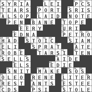 ACROSS 1. Damascus' land 6. Flowery wreath 9. Personal Computers (abbr.) 12. Rends 13. Left side of a ship or aircraft 14. Indian titles of respect 15. Columnist Joseph or Stewart 16. Put down 17. Short letter 18. Fenced enclosure 19. Object of repulsion 20. Drink excessively 21. Suggestive of the supernatural 23. RI univ. 24. Pulitzer Prize-winning author Ferber 25. Stone: prefix 28. Possessed 30. Unemotional 34. Thailand, formerly 35. Connecticut Ivy Leaguer 36. Small fatty European fish 38. Had dinner 39. Loose flowing garment 41. Tarsus (plural) 43. Nine, plus one 44. Exchanges for money 46. Assistant 48. Raised railways 49. Singer Brickell 50. In a ____ (agitated or irritated) 51. Create 53. Distress signal 56. Butter sub 57. French philosopher Descartes 58. 61 cubic inches 60. Relief 61. Pismires 62. First name in cosmetics 63. Music discs 64. 23rd letter of the Greek alphabet 65. Fur scarf DOWN 1. R.R. building 2. Sharp bark 3. To erase 4. Pressed 5. Cleo's killer 6. Grant temporary use of 7. One of the Great Lakes 8. It would 9. Conciliate 10. Quote 11. Compass dir. 13. Shaw product 14. Sounds asleep 19. Naughty children 20. Uncastrated adult male sheep 22. Followers of ems 24. The property of being fit to eat 26. Assign a rank or rating to 27. Presage 28. Possessive pronoun 29. _ vera 31. Elect 32. Lyricist Gershwin 33. Auto 37. Sadhe (variant) 40. American author Paul (1891-1958) 42. One more than two 45. Fast jet (abbr.) 47. Stop 49. Supplements with great effort 50. Downhill vehicle 51. Not women's 52. Opposed to 54. "Beetle Bailey" pooch 55. Sew up the eyelids of hawks and falcons 56. The grampus (Milton) 57. Strike 58. French article 59. To riddle