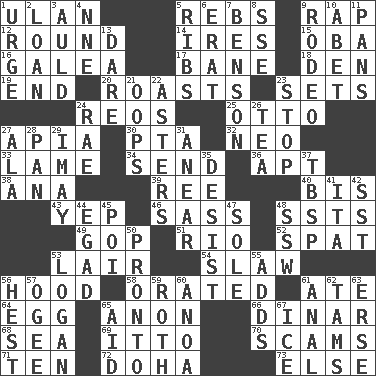 ACROSS 1. Uhlan (variant) 5. Confederate soldiers (slang) 9. Strike 12. One shot 14. Angers 15. Chief or king in Benin or Nigeria 16. An organ shaped like a helmet 17. Object of repulsion 18. Lair 19. Conclusion 20. Cooks with dry heat, as in an oven 23. Puts into a specified state 24. Vintage cars 25. "Beetle Bailey" pooch 27. Capital of Western Samoa 30. Parent Teacher Association (abbr.) 32. Modern: prefix 33. Unable to walk 34. Transmit 36. Fitting 38. Santa ___, CA 39. To sift 40. Twice 43. Slangy assent 46. Backtalk 48. Fast planes 49. Republican Party 51. _ de Janeiro 52. Petty quarrel 53. Den 54. Cole _ (cabbage dish) 56. Parka part 58. Spoke pompously 61. Had dinner 64. Ovum 65. Soon (poet.) 66. Middle Eastern gold or silver currency 68. Ocean 69. "Tell ____ the Marines!" 70. Fraudulent business schemes 71. Nine, plus one 72. Capital of the state of Qatar 73. Otherwise DOWN 1. Goad 2. Grant temporary use of 3. Old (Scot.) 4. Compass dir. 5. Chest bones 6. Part of Q.E.F. 7. Gillaume's butler role 8. Compass dir. 9. Cowboy competition 10. Collude with 11. Zero-star reviews 13. Have the gumption 21. I made a mistake 22. Michaelmas daisies 23. Obstruct or block passage 24. Actress Charlotte 26. Afternoon social gathering 27. Wing 28. Baking dish 29. "If ____ say so..." 31. Approach 35. Stop 37. Cook's measure (abbr.) 41. Call ___ day 42. Fast jet (abbr.) 44. Mild oath 45. Luau course 47. Not divided or shared with others 48. Compass dir. 50. Right away 53. Utah city north of Ogden 55. Sums up 56. Command 57. Double curve, resembling the letter S 59. Writer of Portnoy's Complaint (1969) 60. Small Philippine buffalo 61. Of or related to the anus 62. Scottish caps 63. Celtic language 65. Assist 67. Frozen water