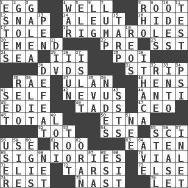ACROSS 1. Ovum 4. Water source 8. Carrot, for example 12. Fastener 14. Eskimo relative 16. Flintstone garb 17. Lacquered or enameled metalware 18. Complicated, petty procedures 20. Make improvements or corrections to 22. Before (prefix) 23. Fast jet (abbr.) 24. Ocean 25. One more than two 28. Luau course 30. Movie discs 31. Long narrow piece of something 35. Actress Charlotte 37. ____ Bator 40. Coop moms 41. Automatic 42. Congenital growth or mark on the skin 44. Against 45. Singer Brickell 46. Bits 47. Corporate head (abbr.) 48. Add up to 50. Inactive volcano in Sicily 52. Small child 54. Compass dir. 55. _-fi 58. Purpose 61. Friend of Pooh 63. Ingested 65. Seigniories (variant) 70. Small bottle 71. Writer Wiesel 72. Tarsus (plural) 73. Otherwise 74. Respite 75. Political cartoonist Thomas 76. Allow DOWN 1. _____ Park, CO 2. Dwarf 3. An organ shaped like a helmet 4. Armed conflict 5. Biblical high priest 6. Part of a journey 7. Mass 8. 17th letter of the Greek alphabet 9. Petroleums 10. Lyric poems 11. Trial 13. Writing instrument 15. Canvas cover 19. Vintage cars 21. HTML Container Element 26. Goddess of spring and wife of Bragi 27. Small island 29. New York city 30. Outscore 32. French philosopher Descartes 33. To the inside or interior of 34. 23rd letter of the Greek alphabet 35. Make new 36. Set down 38. Actress Gardner 39. Unclothed pictures 41. Put into a specified state 43. Fast planes 49. Australian parrot (variant) 51. Born 53. A blast of a horn 55. Free from disturbance or agitation 56. Desist 57. An arm off of a larger body of water 58. One who uses or employs something 59. Filth; sediment 60. The front part of a cuirass 62. NW Algerian seaport 64. "___ Maria" 66. Fish or hair follower 67. Retirement account (abbr.) 68. Curvy letter 69. Be seated