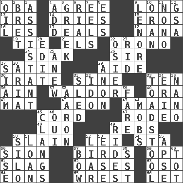 ACROSS 1. Chief or king in Benin or Nigeria 4. Match 9. Yearn 13. Big collection agency 14. Frees from moisture 15. Greek god of love 16. French article 17. Allots cards 18. Nanny 19. Make a knot 21. Raised railways 22. U. of Maine site 24. Neighbor of Neb. 26. Title for a knight 27. Smooth fabric 29. Assistant 30. Feeling or showing extreme anger 31. Trig term 33. "___ Little Indians" 36. The 18th letter of the Arabic alphabet 37. Apple salad 40. Mouth or opening 41. Floor protector 42. Age 43. At full speed 45. Drawstring 47. Cowboy competition 48. Nilotic language 49. Confederate soldiers (slang) 50. Killed 52. Luau accessory 54. R.R. building 56. The Jewish people; Israel 57. Avian creatures 59. Elect 61. Volcanic refuse 62. Fertile tracts in a desert 63. Bear (Spanish) 64. Immeasurably long periods of time 65. Take or capture by force 66. Allow DOWN 1. Lubricate 2. Cy Young winner Saberhagen 3. Aide 4. Increase 5. Hellenic 6. Monetary unit of Yemen 7. Snakelike fish 8. Double-curved letter 9. Poe poem 10. NW Algerian seaport 11. Words to Nanette 12. Girls' org. (abbr.) 20. Prepare for publication 22. Flexible twig of a willow tree 23. To free from 25. Afresh 27. Thailand, formerly 28. Operatic vocal solo 29. Soon (poet.) 31. Downhill vehicle 32. Wedding promise 33. Inedible or poisonous agaric 34. 4th largest of the Great Lakes 35. Billionth: prefix 38. Composer Copland 39. Conductor's collection 44. Crowds into 45. Rings like a ship's bell 46. Fr. "Yes" 49. Amusement-park features 50. Grain storage tower 51. Grant temporary use of 52. One who doesn't tell the truth 53. Celtic language 55. Domed church section 56. Compass dir. 57. Ribbon knot 58. Fast jet (abbr.) 60. Small child