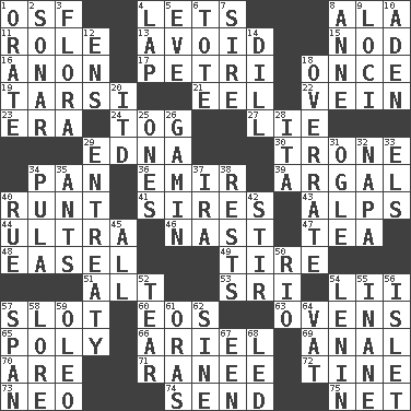 ACROSS 1. Order of Saint Francis (abbr.) 4. Allows 8. In the manner of 11. Hero or heavy, e.g. 13. Prevent from happening 15. Allow head to fall sleepily 16. At once, immediately (arch.) 17. _ dish (used to culture cells) 18. At one time in the past 19. Tarsus (plural) 21. Snakelike fish 22. Distinctive style or manner 23. Epoch 24. Coat; cloak 27. Untruth 29. Pulitzer Prize-winning author Ferber 30. Heavy duty weighing machine 34. Baking dish 36. Independent ruler or chieftain 39. Therefore, facetiously 40. Undersized animal 41. Titles for men of rank and authority 43. High mountains 44. Extreme 46. Political cartoonist Thomas 47. Afternoon social gathering 48. Artist's stand 49. Hoop that covers a wheel 51. Keyboard modifier key 53. Indian title of respect (Mr.) 54. Cards in a Roman deck? 57. Groove 60. Greek goddess of the dawn 63. Baking chambers 65. Many (prefix) 66. Satellite of Uranus 69. Of or related to the anus 70. "We ___ not amused" (Victoria) 71. The wife of a rajah (variant) 72. Prong on a fork 73. Modern: prefix 74. Post 75. Fish or hair follower DOWN 1. Declaim 2. Underwater navigation system 3. Plants 4. Infant locale 5. Night before a holiday 6. Lug 7. Title for a man of rank and authority 8. Singer Murray 9. Locales 10. Arabian gulf 12. Followers of ems 14. Deli pickle 18. Make much ado about nothing 20. It would 25. Washington bills 26. Homeless child 28. Call ___ day 29. Plea 31. Stare at amorously 32. California wine valley 33. Raised railways 34. Monetary unit of Botswana 35. Pismires 37. Lyricist Gershwin 38. Musical pauses 40. Sorrow 42. Move through with a circular motion 45. 100% 50. _ de Janeiro 52. Lacerate 54. Soviet premier 1918-24 55. Empty; void 56. Small island 57. Connect, as a bridge 58. Old wives' tales, e.g. 59. Butter sub 61. Mouths or openings 62. Trig term 64. Large container 67. Car or cant ending 68. Directed