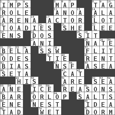 ACROSS 1. Naughty children 5. Atlas unit 8. Label 11. Hero or heavy, e.g. 12. Small Philippine buffalo 14. Insect wing 15. Sports stadium 17. Thespian 18. Car dealer's back yard 19. Sycophants 21. A female animal or person 22. Area sheltered from the wind 23. Followers of ems 24. Two (Sp.) 25. Be seated 27. Cuckoo 28. Nathan's nickname 31. Actor Lugosi 35. Compass dir. 37. Sudden quick movement 38. Lyric poems 39. Neckwear 41. Monthly bill 42. Prejudice 43. Overdraft (abbr.) 45. At sea 46. Stalk of a moss capsule 47. Feline 49. Part of HMS, perhaps 51. "We ___ not amused" (Victoria) 52. Ocean 55. One (Scot) 57. Frozen water 60. Thinks logically 62. Soap unit 63. Lowest deck of a ship 65. Table seasonings 66. Compass dir. 67. A home for chicks 68. It may be bright or harebrained 69. Small boy 70. Soggy 71. Dormintory (informal) DOWN 1. Feeling or showing extreme anger 2. Person of subnormal intelligence 3. Entreaties 4. Post 5. Apple computer (short form) 6. Pismires 7. "Silly old bear" 8. Baron Munchausen's specialties 9. Medicinal plant 10. Yard entry 13. Ancient Greek god of war 16. Opera by Verdi 17. Help 20. Immeasurably long periods of time 26. Kind of red light 29. Prong on a fork 30. Singer James 31. Moves up and down 32. Singer Brickell 33. Resembling or made to resemble leather 34. Slender Brazilian palm 36. Victory 40. Fortification 44. Conductor's collection 48. Beverages made from leaves 50. The Jewish people; Israel 52. Twentieth part of a lira 53. Keyboard key 54. Indian state 55. Collude with 56. Grandmother 58. Group working together 59. Otherwise 61. Expressed in words 64. Baseball player Mel