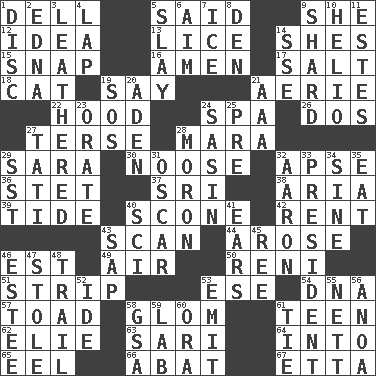 ACROSS 1. Small valley 5. Stated 9. A female animal or person 12. The content of cognition 13. Louse (plural) 14. "______ My Girl" (Turtles hit) 15. Fastener 16. So be it 17. Table seasoning 18. Feline 19. Declare 21. Nest on high 22. Parka part 24. Health resort 26. Two (Sp.) 27. Laconic 28. Hindu Mythology: god of death 29. "Two Mules for Sister ____" 30. Trap for birds or small mammals 32. Domed church section 36. Proofreading order 37. Indian title of respect (Mr.) 38. Operatic vocal solo 39. Periodic rise and fall of the sea level 40. Biscuitlike quick bread 42. Monthly bill 43. Examine hastily 44. Came up 46. Eastern Standard Time (abbr.) 49. Wind 50. Painter Guido (1575-1642) 51. Remove all contents or possession from 53. Compass dir. 54. Heredity factor (abbr.) 57. Frog relative 58. Take by theft 61. Adolescent 62. Writer Wiesel 63. Indian skirt 64. To the inside or interior of 65. Snakelike fish 66. Blind as ____ 67. Singer James DOWN 1. Plate 2. Pulitzer Prize-winning author Ferber 3. Resembling or made to resemble leather 4. Infant locale 5. Kill 6. Direct toward a target or goal 7. Frozen water 8. Lair 9. Pottery fragment 10. Sun: prefix 11. _____ Park, CO 14. Compass dir. 19. Mayday 20. An important port of Yemen 21. Auto club (abbr.) 23. Declaim 24. Indian antelope 25. Before (prefix) 27. Jacques of French films 28. Person of subnormal intelligence 29. Fast jet (abbr.) 31. Motion picture award 32. Composer Copland 33. Elected leader of a country 34. Trig term 35. Ingest 40. _-fi 41. Hearing organs 43. Plant excrement 45. To separate or throw off 46. First name in cosmetics 47. Fur scarf 48. Go after with the intent to catch 52. Binary compound 53. Give off 55. Remaining after all deductions 56. Small Philippine buffalo 58. Girls' org. (abbr.) 59. Experiment locale 60. Mouth or opening 61. Make a knot