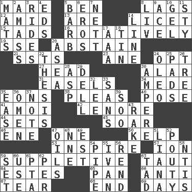 ACROSS 1. Female horse 5. Benjamin's nick name 8. Falls behind 12. Among 13. "We ___ not amused" (Victoria) 14. It is permitted: Lat. 15. Bits 16. Happening in regular succession 19. Compass dir. 20. Refrain by choice 21. Fast planes 23. A saturated hydrocarbon 24. Choose 27. Froth on beer 30. Having or resembling wings 31. Artist's stands 34. Ancient Persian 35. Immeasurably long periods of time 38. Entreaties 40. Airs 41. Mine, in Marseilles 42. Poe poem 44. Arranges properly for use 45. Fly high 46. Compass dir. 47. Single 50. Seaweed 53. Stimulate to action 57. Electrically charged atom 59. Supplementary 63. Pulled tight 64. _____ Park, CO 65. Baking dish 66. Against 67. Pull apart 68. Conclude 69. 24-hour periods DOWN 1. Floor protectors 2. Collect or gather 3. Amusement-park features 4. Begley and Asner 5. Sharp remark 6. Greek god of love 7. Remaining after all deductions 8. 54 in ancient Rome 9. Adept person 10. Set 11. Filthy place 14. Actor's bit 17. Auto club (abbr.) 18. Shallow baking pan 20. Toward the sea 22. College paper 24. Margarine 25. Groovy apts. 26. Family _ (genealogy) 28. Viper 29. Small valley 30. Electrical Unit 32. Area sheltered from the wind 33. Without 35. Relaxation 36. Sign of something about to happen 37. Short letter 39. "Barney Miller" actor Jack 43. Libertine 47. Petroleums 48. Compass dir. 49. Eastern Standard Time (abbr.) 51. Climbing, woody, usually tropical vines 52. Inclined to pout 54. Corncob 55. "Terrible" tsar 56. Tear apart 58. Nuclear Threat Initiatives 59. Put into a specified state 60. Purpose 61. Parent Teacher Association (abbr.) 62. For each 63. Bit