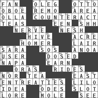 ACROSS 1. Avid follower 4. Cassini of fashion 8. "Beetle Bailey" pooch 12. Mitch Miller's instrument 14. San ____ (Riviera town) 15. Length times width 16. Rounded earthenware pot or jar 17. Neutralize 20. Afternoon social gatherings 21. Car or cant ending 22. Quiet! 23. Effrontery 27. Tender 29. Hub of activity 31. 43,560 square feet 34. Simpsons dad 35. Den 36. "Two Mules for Sister ____" 39. Mayday 41. Small Philippine buffalo 42. One who uses or employs something 43. Administered medicine 46. California wine valley 47. Merit 48. Mouths or openings 51. Amusement-park features 54. Or not 56. Afternoon social gathering 58. Compass direction 61. Pleas 66. _ and Stitch 67. It may be bright or harebrained 68. Lyric poems 69. Position in a hierarchy or organization 70. Old wives' tales, e.g. 71. Undercover agent 72. Perceive with the eye DOWN 1. Lowest support of a structure 2. Competent 3. Pitcher Ryan 4. The grampus (Milton) 5. Lion 6. Australian flightless bird 7. Went 8. Rowing implement 9. File 13 10. Technician 11. Pledge 13. Relaxation 18. "___ Little Indians" 19. Compass dir. 24. 17th letter of the Greek alphabet 25. Zeal 26. Nights before holidays 28. Vegetable dish 30. Wear away 32. River (Sp.) 33. Epoch 34. Ethiopian city, capital of Harari 36. Player for Phoenix 37. White ___ sheet 38. News announcer 40. Fly high 44. Indian title of respect (Mr.) 45. Conclusion 49. Had dinner 50. Ocean 52. Snakelike fish 53. Moves on water 54. Famous astronaut Armstrong 55. Southwest Nigerian state 57. Tiny particle 59. A type of plum 60. Lug 62. Actress Charlotte 63. Wedding promise 64. Snakelike fish 65. Compass dir.