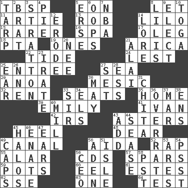 ACROSS 1. Cook's measure (abbr.) 5. Age 8. Allow 11. Nick name for Arthur 13. Director Reiner 14. _ and Stitch 15. More uncommon 16. Health resort 17. Cassini of fashion 18. Parent Teacher Assoc. 19. Singles 21. N. Chile seaport 22. Periodic rise and fall of the sea level 24. For fear that 25. Main course 27. Ocean 29. Small Philippine buffalo 30. Mesonic 32. Monthly bill 33. Theater features 35. Residence 39. Poet Dickinson 41. _ the terrible 42. Big collection agency 43. Michaelmas daisies 45. The bottom of a shoe or boot 48. Letter starter 49. Lessep's creation 50. Opera by Verdi 52. Strike 55. Having or resembling wings 56. Music discs 57. Practice fights 59. Plant holders 60. Snakelike fish 61. _____ Park, CO 62. Compass dir. 63. Single 64. Trial DOWN 1. Canvas cover 2. Naughty child 3. Ski resort town in Vermont 4. Sliced dessert 5. Celtic language 6. I made a mistake 7. Basketball assoc. 8. Ms. Damita and namesakes 9. Voters do this 10. Ancient Roman robe 12. Wear away 14. Old wives' tales, e.g. 20. Born 21. Mountain range southwest of Kyrgyzstan 23. Feeling or showing extreme anger 25. Hearing organ 26. Compass dir. 27. Arrange properly for use 28. Double-curved letter 30. Fifth month 31. Riviera of "Kiss of the Spider Woman" 33. Title for a knight 34. Raised railways 36. Make much ado about nothing 37. Impair 38. Followers of ems 40. Place where flour is made 43. Increase 44. Gospel singer Marvin 45. Rings 46. Maternal 47. Hearing organs 49. Smile enhancers 50. Arabian gulf 51. Capri or Wright 53. Ancient Greek god of war 54. Inconspicuous attention getter 56. Corporate head (abbr.) 58. Pacific Standard Time (abbr.)