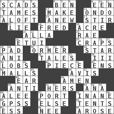 ACROSS 1. Loads 6. Benjamin's nick name 9. Car or cant ending 12. Corrects by punishment or discipline 13. Create 14. Southwest Nigerian state 15. High up in or into the air 16. Afresh 17. Commotion 18. Falsehood 19. Flintstone 20. 1/640 square mile 21. Silent film actress Nazimova 23. Actress Charlotte 24. Needle case 25. Dice game 28. Writing tablet 30. Channel Islands abalone 34. Play the lead 35. Cuckoo 36. Stories 38. One more than two 39. Tennis shots 41. Part 43. Followers of ems 44. Shopping centers 46. Advice 48. Ewer handle 49. So be it 50. Against 51. Possessive pronoun 53. Santa ___, CA 56. Toward shelter 57. Left side of a ship or aircraft 58. Lacking in sense or substance 60. Global Positioning Systems (abbr.) 61. Otherwise 62. Portable shelters 63. Curvy letter 64. Born 65. Came up DOWN 1. R.R. building 2. Give a ring to 3. Mine, in Marseilles 4. Outscore 5. Fast jet (abbr.) 6. Object of repulsion 7. Made supply last 8. ___ Haven, CT 9. Pleas 10. Singer Brickell 11. Not either 13. Hindu Mythology: god of death 14. Motion picture awards 19. Seductive woman who exploits men 20. Curve 22. Nilotic language 24. The property of being fit to eat 26. Ache 27. Indian titles of respect 28. Inside of hand 29. Small Philippine buffalo 31. Atlas unit 32. Connecticut Ivy Leaguer 33. To separate or throw off 37. Fraudulent business schemes 40. Chalkboards 42. Night before a holiday 45. _ Lanka 47. More empty; more void 49. Johnson of "Laugh-In" 50. High mountains 51. Opening into or through something 52. Celtic language 54. Billionth: prefix 55. Pismires 56. Mature 57. Fenced enclosure 58. Call ___ day 59. Compass dir.