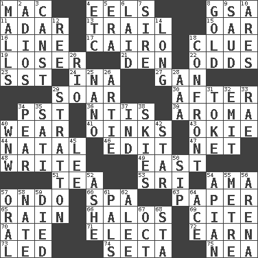 ACROSS 1. Apple computer (short form) 4. Snakelike fish 8. Girls' org. (abbr.) 11. The sixth month of the Jewish calendar 13. Get behind 15. Rowing implement 16. Actor's bit 17. Capital of Egypt 18. A slight indication 19. Failure 21. Lair 22. Probability 23. Fast jet (abbr.) 24. _ tizzy (2 wds.) 27. Separate the seeds from cotton 29. Fly high 30. Following 34. Pacific Standard Time (abbr.) 36. Nuclear Threat Initiatives 39. Odor 40. Erode 41. Pig sounds 43. Migrant worker of the '30s 44. Relating to or accompanying birth 46. Prepare for publication 47. Fish or hair follower 48. Compose 49. Compass direction 51. Afternoon social gathering 53. Indian title of respect (Mr.) 54. Wet nurse (var.) 57. Southwest Nigerian state 60. Health resort 63. Some stationery 65. Water falling in drops from the sky 66. Auras 69. Quote 70. Had dinner 71. Opt 72. Merit 73. Directed 74. Bristle 75. Teachers' org. DOWN 1. Shopping centers 2. Goodbye (Sp.) 3. 2nd pers. sing. pres. of can (arch.) 4. And so on (abbr.) 5. Epoch 6. Put down 7. Title for a man of rank and authority 8. Gilt 9. Saudi Arabian king (1953-1964) 10. Ancient Greek god of war 12. Portuguese money of account (variant) 14. Having great length 18. Meet 20. _ de Janeiro 25. Billionth: prefix 26. Nick name for Arthur 28. American Automobile Association (abbr.) 29. Ski resort town in Vermont 31. Puff or smoke 32. Send forth 33. Actress Charlotte 34. Lightbulb-shaped fruit 35. Suttee (variant) 37. Indiana (abbr.) 38. Atmospheres 40. Compass dir. 42. Play the lead 45. Area sheltered from the wind 50. Small drink 52. American tennis player Robert 54. Bee-related 55. Distance measurement (Brit.) 56. Sports stadium 57. Taken by mouth 58. Nathan's nickname 59. Passed on 61. Friends 62. Toward shelter 64. Adept person 67. Sep. follower 68. R.R. building
