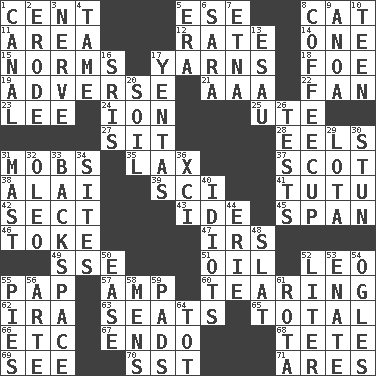 ACROSS 1. Penny 5. Compass dir. 8. Domesticated feline 11. Length times width 12. Assign a rank or rating to 14. Single 15. Typical models 17. Tall tales 18. Enemy 19. Contrary to your interests or welfare 21. American Automobile Association (abbr.) 22. Air blower 23. Area sheltered from the wind 24. Electrically charged atom 25. Shoshoni 27. Be seated 28. Snakelike fish 31. Disorderly crowds 35. Not strict 37. Native of Scotland 38. Jai _ 39. _-fi 41. Ballerina skirt 42. Religious group 43. Binary compound 45. Connect, as a bridge 46. Casino tip 47. Big collection agency 49. Compass dir. 51. Lubricate 52. Lion 55. Infant food 57. Electrical Unit 60. Pulling into pieces 62. Lyricist Gershwin 63. Theater features 65. "_____ Recall" 66. And so on (abbr.) 67. Inside; within (prefix) 68. False hair 69. Perceive with the eye 70. Fast jet (abbr.) 71. Ancient Greek god of war DOWN 1. Lessep's creation 2. Eat (away) 3. Boldness 4. Not wild 5. Period 6. "Two Mules for Sister ____" 7. Inactive volcano in Sicily 8. Java holder (2 wds.) 9. Small Philippine buffalo 10. Adolescent 13. He sold his birthright 16. Indian titles of respect 17. Gossips 20. The visible part of the earth's surface 26. Trials 29. Globular water bottle used in Asia 30. Surprise greatly 31. Vertical spar for supporting sails 32. Margarine 33. Keyboard key 34. Settings 36. One more than ninety 40. Foolish or stupid persons 44. One of the Great Lakes 48. Narrow board 50. Relaxation 52. 61 cubic inches 53. Related on the mother's side 54. Stares 55. Sliced desserts 56. Johnson of "Laugh-In" 58. Not women's 59. Writing tablets 61. Round or rotation of duties 64. Small child
