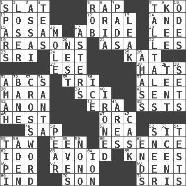 ACROSS 1. Narrow board 5. Reproach for some lapse or misdeed 8. Ring climax 11. Introduce or present, as a question 12. Taken by mouth 14. Added to 15. Indian state 17. Tolerate 18. Area sheltered from the wind 19. Thinks logically 21. White ___ sheet 22. French article 23. _ Lanka 24. Allow 25. Krazy ___ of comics 27. Compass dir. 28. Floor protectors 31. Lettered men learn these first 35. Three (prefix) 37. Toward shelter 38. Hindu Mythology: god of death 39. _-fi 41. Posted 42. Soon (poet.) 43. Epoch 45. Fast planes 46. Behest 47. The grampus (Milton) 49. Plant excrement 51. Teachers' org. 52. Be seated 55. The 23rd letter of the Hebrew alphabet 57. Car or cant ending 60. Center 62. Wedding promise 63. Keep away from 65. Leg joints 66. For each 67. Western Nevada city 68. Incision 69. Indiana (abbr.) 70. Male child 71. Indian titles of respect DOWN 1. Practice fights 2. Failure 3. Slender Brazilian palm 4. Beverages made from leaves 5. Director Reiner 6. Roberta Peters solo 7. Writing tablets 8. Baron Munchausen's specialties 9. Leg joint 10. Lyric poems 13. Path through which fluid escapes 16. Undercover agent 17. Michaelmas daisies 20. Egg locale 26. Collect or gather 29. Portable shelter 30. Puts into a specified state 31. Housemaid 32. Object of repulsion 33. What you're doing now 34. Before Barbara or Clara 36. Frozen water 40. Pressed 44. Ancient Greek god of war 48. Keg 50. Lightbulb-shaped fruit 52. Contemptuous expression 53. Ancient Celtic tribe of eastern Britain 54. Trials 55. Native american tent (variation) 56. An important port of Yemen 58. Nights before holidays 59. Words to Nanette 61. Conclusions 64. Electrically charged atom