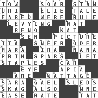 ACROSS 1. Pull behind 4. Fly high 8. Comedian Laurel of Laurel & Hardy 12. RI univ. 13. Writer Wiesel 14. Lie 15. Having ears or earlike features 18. Past tense of be (plural) 19. Governing power 20. Imposing or collecting, as a tax 22. Floor covering 23. Former U.S. Attorney General Janet 24. Krazy ___ of comics 25. Elected rep. 26. Photo 30. Call ___ day 33. Scornful expression 36. River in Europe 37. Hindu Mythology: god of death 39. Retirement account (abbr.) 40. Grandmother 41. Demure 42. Practice fights 44. Allow 45. Paper fasteners 47. Automobile 50. Sight organ 51. Capital of Western Samoa 53. "We ___ not amused" (Victoria) 54. Electrical Measurement 57. "Two Mules for Sister ____" 59. Highlander 61. Bobsleighs 63. Heroin 64. In addition 65. Compass dir. 66. Comfort 67. Pace 68. Make lace DOWN 1. Third day of the wk. 2. Of the mouth 3. One who wires 4. Stitched 5. Cassini of fashion 6. Wind 7. To separate or throw off 8. Ski resort town in Vermont 9. Drawn tight 10. 100% 11. Born 16. Nights before holidays 17. Centimeter-gram-second unit of force 21. Charged particles 22. Apple computer (short form) 24. Apertif with cassis 26. Lightbulb-shaped fruit 27. Allodial 28. French philosopher Descartes 29. Part of Q.E.F. 30. Naughty children 31. Small pie 32. Roberta Peters solo 34. Pinches, bites 35. Epoch 38. Electrical Measurement 42. Observe 43. Scram! 46. Sodium hydroxide 48. Flats, for short 49. Monetary unit of Yemen 52. Rep 53. Ancient river in northeast Turkey 54. Compass direction 55. Medicinal plant 56. Pulitzer Prize-winning author Ferber 57. Compass dir. 58. Alias (abbr.) 59. Slender fish 60. In the manner of 62. Put into a specified state