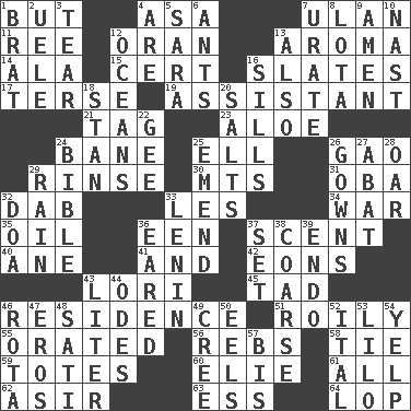 ACROSS 1. Yet 4. White ___ sheet 7. ____ Bator 11. To riddle 12. NW Algerian seaport 13. Odor 14. Chicken ___ king 15. An absolute certainty 16. Chalkboards 17. Laconic 19. Aide 21. Label 23. Medicinal plant 24. Object of repulsion 25. Pipe bend 26. E Mali city 29. Remove soap 30. Mountains (abbr.) 31. Chief or king in Benin or Nigeria 32. Pat or tap gently 33. French article 34. Armed conflict 35. Petroleum 36. Car or cant ending 37. Odor 40. A saturated hydrocarbon 41. Also 42. Immeasurably long periods of time 43. Australian parrot (variant) 45. Small amount or degree 46. Home 51. Agitated, as a liquid 55. Declaimed 56. Confederate soldiers (slang) 58. Neckwear 59. Hauls 60. Writer Wiesel 61. Everything 62. SW Saudi Arabia district 63. Double-curved letter 64. Chop off DOWN 1. Naughty child 2. Ubangi River tributary 3. Pull apart 4. "We ___ not amused" (Victoria) 5. "Two Mules for Sister ____" 6. Pismires 7. A salt of uric acid 8. Globular water bottle used in Asia 9. So be it 10. Political cartoonist Thomas 12. Seas 13. In addition 16. Beverly of Met fame 18. Comedian Laurel of Laurel & Hardy 20. Table seasonings 22. Unit of force equal to gravity 24. God's Word 25. Make improvements or corrections to 26. Long dresses 27. Blind as ____ 28. Boat paddle 29. Water falling in drops from the sky 32. ___ good deed 33. Soviet premier 1918-24 36. Having ears or earlike features 37. Put into a specified state 38. Unrefined 39. Inside; within (prefix) 43. 61 cubic inches 44. Lyric poems 46. Round or rotation of duties 47. Greek god of love 48. Suttee (variant) 49. Algonquian 50. Snakelike fish 52. Slanted text style (abbr.) 53. _ and Stitch 54. Sharp bark 57. Twice