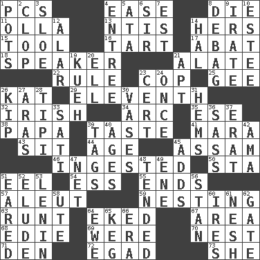 ACROSS 1. Personal Computers (abbr.) 4. Relaxation 8. Expire 11. Water jar 13. Nuclear Threat Initiatives 14. Possessive pronoun 15. Instrument 16. Small pie 17. Blind as ____ 18. Orator 21. Having winglike extensions 22. Court order 23. Police officer (slang) 25. Unit of force equal to gravity 26. Krazy ___ of comics 29. Veterans Day date 32. From or relating to Ireland 34. Curve 35. Compass dir. 38. Dad 39. Clothes sense 41. Hindu Mythology: god of death 43. Be seated 44. Personal question 45. Indian state 46. Eaten 50. R.R. building 51. Snakelike fish 54. Curvy letter 55. Conclusions 57. Eskimo relative 59. Nestling 63. The smallest animal of a litter 64. Made supply last 67. Length times width 68. Singer Brickell 69. We are 70. Egg locale 71. Lair 72. Mild oath 73. A female animal or person DOWN 1. Plant holders 2. Hoof sound 3. A type of plum 4. Main course 5. "One Day ___ Time" 6. Title for a knight 7. Eastern Standard Time (abbr.) 8. Debunk (Brit. slang) 9. Feeling or showing extreme anger 10. First name in cosmetics 12. Having or resembling wings 14. Actor Linden 19. Malaysian steamed pastry 20. Pipe bend 21. Fitting 23. Foregone conclusion 24. At one time in the past 26. Monetary unit of Laos 27. Ancient river in northeast Turkey 28. Native american tent (variation) 30. Flower holders 31. Folds over and sews together 33. Suttee (variant) 36. Backtalk 37. Part of Q.E.F. 39. Labels 40. Matures 42. Wet nurse (var.) 45. Does sums 47. Fish or hair follower 48. Watched over 49. Compass dir. 51. Having ears or earlike features 52. Dodge 53. Soviet premier 1918-24 56. Comedian Laurel of Laurel & Hardy 58. Shoshoni 60. Angers 61. Soft 62. Yard entry 64. She-sheep 65. Cask 66. Period