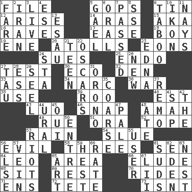 ACROSS 1. Do some clerical work 5. Republicans 9. Shallow baking pan 12. Originate 14. Ancient river in northeast Turkey 15. Alias (abbr.) 16. All-night dance parties 17. Relaxation 18. Male child 19. Compass dir. 20. Ringlike coral islands and reefs 23. Immeasurably long periods of time 24. Institutes legal proceedings 25. Inside; within (prefix) 27. Trial 30. Environmental prefix 32. Lair 33. At sea 34. Drug cop 36. Armed conflict 38. Purpose 39. Friend of Pooh 40. Eastern Standard Time (abbr.) 43. Nilotic language 46. Fastener 48. Housemaid 49. Regret 51. Mouth or opening 52. Drink excessively 53. Water falling in drops from the sky 54. Turn sharply 56. Morally bad or wrong 58. Triplets 61. Elected rep. 64. Lion 65. Length times width 66. Evade 68. Be seated 69. State of inaction 70. Amusement-park features 71. Followers of ems 72. Wig 73. Is not DOWN 1. Conductor's collection 2. SW Asia republic 3. Not recorded 4. Compass dir. 5. Highlander 6. Of the mouth 7. Went by 8. Compass dir. 9. Off limits 10. Picture 11. Negative votes 13. He sold his birthright 21. Adolescent 22. Motion picture awards 23. Pulitzer Prize-winning author Ferber 24. R.R. building 26. ___ Haven, CT 27. The 19th letter of the Greek alphabet 28. Double-curved letter 29. Stitch closed the eyes of (a falcon) 31. U. of Maine site 35. Rough 37. San ____ (Riviera town) 41. Plant excrement 42. Definite Article 44. Mountain range 45. Fr. "Yes" 47. Diluted with white 48. Had dinner 50. Main course 53. Disturbances 55. One who uses or employs something 56. Otherwise 57. Distinctive style or manner 59. Command 60. Pace 61. Beer foam 62. Locale of original sin 63. Egg locale 65. Tate display 67. Cards in a Roman deck?