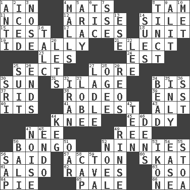ACROSS 1. The 18th letter of the Arabic alphabet 4. Floor coverings 8. Scottish cap 11. Non-commissioned officer (abbr.) 12. Originate 14. Filth; sediment 15. Trial 17. Shoestrings 18. A single undivided whole 19. Under perfect conditions 21. Choose 23. French article 24. Eastern Standard Time (abbr.) 25. Religious group 27. Old wives' tales, e.g. 30. Player for Phoenix 31. Fodder prepared in a silo 34. Again 37. To free from 38. Cowboy competition 39. Followers of ems 40. It is 41. Most capable 43. Keyboard modifier key 44. Leg joint 45. Whirlpool 47. Born 49. To riddle 50. Beat drum 52. Fools 56. Expressed in words 57. 13-14th century defensive garment 60. Three-handed card game 61. In addition 62. All-night dance parties 63. Bear (Spanish) 64. Sliced dessert 65. Diluted with white 66. Teachers' org. DOWN 1. Against 2. On the rocks 3. Olfactory organ 4. Shopping centers 5. Like ___ of sunshine 6. Nervous spasm 7. Compass dir. 8. A color or tint 9. Set down 10. Was introduced to 13. Compass dir. 14. Takes to court 16. Baby powder 20. Allows 22. Area sheltered from the wind 25. Set of matching outer garments 26. Extremities 27. Dipping utensil 28. Double curve, resembling the letter S 29. Vintage cars 30. Indian title of respect (Mr.) 32. SW Asia republic 33. Ear part 34. Necklace unit 35. In an inward manner 36. Fast jet (abbr.) 42. Adolescent 44. Cask 46. Habitations of wild animals 47. Annoying sound 48. Inside; within (prefix) 49. Remove soap 50. Indonesian resort city 51. Boat paddle 52. Christmas carol 53. Image 54. Comfort 55. Portico 56. Plant excrement 58. Head covering 59. Federal power corp.
