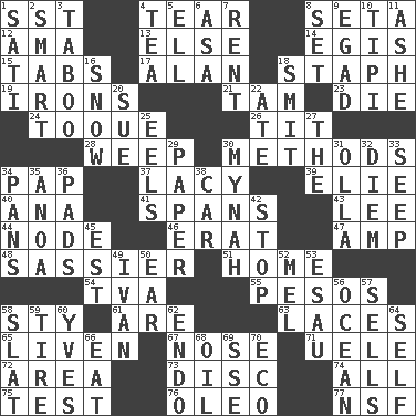ACROSS 1. Fast jet (abbr.) 4. Rend 8. Stalk of a moss capsule 12. Wet nurse (var.) 13. Otherwise 14. The front part of a cuirass 15. Bar bills 17. Actor Alda or Thicke 18. Staphylococcus 19. Metal shackles 21. Scottish cap 23. Pass on 24. Woman's close-fitting hat 26. Teat (slang) 28. Shed a tear 30. Modes 34. Infant food 37. Made of lace 39. Writer Wiesel 40. Santa ___, CA 41. Connects, as a bridge 43. Area sheltered from the wind 44. Connecting point 46. Part of Q.E.F. 47. Electrical Unit 48. More impudent 51. Dwelling 54. Federal power corp. 55. Mexican monetary units 58. Filthy place 61. "We ___ not amused" (Victoria) 63. Shoestrings 65. Make or become more lively 67. Olfactory organ 71. Ubangi River tributary 72. Length times width 73. Plate 74. 100% 75. Trial 76. Butter sub 77. Overdraft (abbr.) DOWN 1. Suttee (variant) 2. Don Adams' spy role 3. Off limits 4. Afternoon social gathering 5. Pipe bend 6. White ___ sheet 7. Monthly bill 8. Put into a specified state 9. Mild oath 10. Native american tent (variation) 11. American tennis player Robert 16. Frozen precipitation 18. Stricken, poetically 20. Institute legal proceedings 22. Had dinner 25. Snakelike fish 27. Definite Article 29. Some stationery 30. Non-adult bird? 31. Spanish pot 32. South Vietnam president (1954) 33. Ooze 34. Zero-star reviews 35. Small Philippine buffalo 36. Groovy apts. 38. Auto 42. Cease 45. Eastern Standard Time (abbr.) 49. "Terrible" tsar 50. Ewer handle 52. Cartoonist voice _ Blanc 53. Son of Isaac 56. Sea 57. Makes a sale 58. Narrow board 59. Become fatigued 60. Jacques Cousteau's middle name 62. Inside; within (prefix) 64. Oneself 66. Consume 68. Lubricate 69. Compass dir. 70. Environmental prefix
