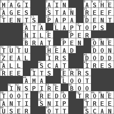 ACROSS 1. Wise men 5. The 18th letter of the Arabic alphabet 8. American tennis player Robert 12. Eras 13. Comedian Laurel of Laurel & Hardy 15. Coral ridge 16. Portable shelters 18. Dad 19. Scratch 20. _ moment's notice (2 wds.) 22. Portable computers 24. The longest river in the world 26. For each 27. Naughty child 28. Fenced enclosure 29. Single 32. Ballerina skirt 35. Froth on beer 37. Spanish title 38. Ardor 39. Big collection agency 40. Texas town _ City 41. 100% 42. Get outta here! 43. Angers 44. Portuguese money of account (variant) 45. ___ a Wonderful Life 46. Blunders 49. Housemaid (var.) 50. Spoils 51. Motivate 55. Oct. 31 cry 56. A blast of a horn 57. Make new 59. Marketplace scale 63. Opposed to 64. Sever or remove by pinching or nipping 65. Family _ (genealogy) 66. One who makes use of a thing 67. Baseball player Mel 68. Examine minutely or intensely DOWN 1. Floor protector 2. Ripen 3. Commissioned military rank (abbr.) 4. Byzantium, centuries later 5. Cleo's killer 6. Slanted text style (abbr.) 7. California wine valley 8. Zeal 9. Ooze 10. Coop moms 11. Newt 14. Slept 17. Agitate 21. Insect wing 23. "___ Little Indians" 25. Value system 28. Soft color 29. Aroma 30. Connecting point 31. Extremities 32. Russian ruler 33. Ubangi River tributary 34. Lie 36. Epoch 40. What propaganda does 42. Flight of steps 45. Naughty child 47. Director Reiner 48. Carrot, for example 49. Moving or stirring 51. Charged atoms 52. Brief written record 53. Western Nevada city 54. Prepare for publication 56. The 19th letter of the Greek alphabet 58. Elect 60. The grampus (Milton) 61. Teachers' org. 62. Car or cant ending