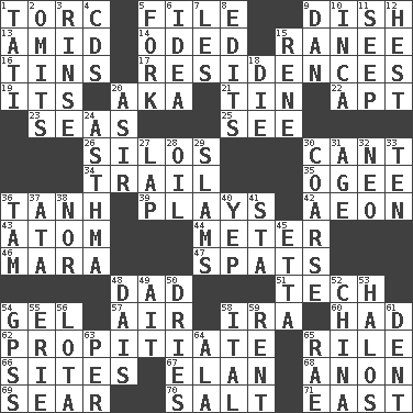 ACROSS 1. Torque (variant) 5. Do some clerical work 9. Food container 13. Among 14. Wrote a lyric poem 15. Indian princess (variant) 16. Canisters 17. Dwellings 19. ___ a Wonderful Life 20. Alias (abbr.) 21. Metal container 22. Fitting 23. Oceans 25. Observe 26. Grain storage towers 30. Patter 34. Get behind 35. Double curve, resembling the letter S 36. Hyperbolic tangent 39. Live dramatic performances 42. A really long time 43. Smallest unit of an element 44. Distance measurement 46. Hindu Mythology: god of death 47. Arguments over trivial matters 48. Male parent 51. Georgia ____ (Atlanta school) 54. Set 57. Atmosphere 58. Lyricist Gershwin 60. Possessed 62. Conciliate 65. Cause heat under the collar 66. Settings 67. Enthusiasm 68. At once, immediately (arch.) 69. Singe 70. Table seasoning 71. 90 degrees DOWN 1. Jacques of French films 2. Leaves out 3. Remove soap 4. Music discs 5. Tined utensil 6. It may be bright or harebrained 7. French article 8. Proofreads 9. Daniel's nick name 10. South American Indian 11. Ooze 12. Behest 15. French philosopher Descartes 18. Pass on 20. SW Saudi Arabia district 24. Respiratory problem 27. Infant locale 28. Lubricate 29. Criticizes harshly 30. Rough 31. Grow older 32. Modern: prefix 33. "___ Little Indians" 36. Scottish cap 37. _ moment's notice (2 wds.) 38. Not either 40. Slangy assent 41. R.R. building 45. Singer James 48. Raised platform 49. Small island 50. Frees from moisture 52. Large country 53. Radiant circles of light 54. Global Positioning Systems (abbr.) 55. One of the Great Lakes 56. Globular water bottle used in Asia 58. Slanted text style (abbr.) 59. Monthly bill 61. Incision 63. For each 64. According to 65. Actress Charlotte