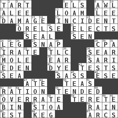 ACROSS 1. Small pie 5. Raised railways 8. Leather borer 11. Toward shelter 12. Rich soil 13. Area sheltered from the wind 14. Break 17. Event 19. Threatening words 21. Opts 22. Lick closed 23. Elected rep. 24. Part of a journey 27. Fastener 29. Tax preparer (abbr.) 32. Feeling or showing extreme anger 34. Affectionate concern, for short 36. Scorch 37. Undercover agent 38. Hearing organ 39. Indian skirt 40. Genesis locale 41. Color 42. Trials 43. Ocean 44. Backtalk 46. Compass dir. 47. Had dinner 50. Afternoon social gatherings 52. Food allowance for one day 55. Watched over 57. Make much ado about nothing 59. Cylindrical with tapered ends 62. Storage container 63. Portico 64. Precipitation 65. Eastern Standard Time (abbr.) 66. Barrel 67. Curves DOWN 1. Small amount or degree 2. In the manner of 3. San ____ (Riviera town) 4. Pulls apart 5. Age 6. Shoestrings 7. Grin 8. Actor Baldwin 9. Gone 10. Allows 12. Whopper 15. Honkers 16. Style 18. Lair 20. Scheduled 24. Citrus fruits 25. Wear away 26. An organ shaped like a helmet 28. Live dramatic performances 29. Desist 30. Actors' quests 31. Get up 33. "___ Little Indians" 35. Make 36. Compass dir. 42. Sadhe (variant) 45. Emitted 47. Atmosphere 48. Cod relative 49. Maternal 51. Spanish missionary in California 52. Loose flowing garment 53. Opinion 54. Portable shelter 55. Beverage made from leaves 56. Letter starter 58. Coat; cloak 60. Nervous spasm 61. Followers of ems