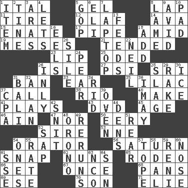 ACROSS 1. Slanted text style (abbr.) 5. Set 8. Pet locale 11. Hoop that covers a wheel 12. Norwegian king 14. Actress Gardner 15. Related on the mother's side 17. Corncob 18. Among 19. Makes clutter 21. Looked after 23. Mouth edge 25. Wrote a lyric poem 26. Small island 27. Air pressure measure (abbr.) 28. _ Lanka 31. Forbid 33. Hearing organ 35. Pale purple color 37. Give a ring to 38. River (Sp.) 40. Cause to be 41. Romps 43. Movie disc 45. Personal question 46. The 18th letter of the Arabic alphabet 47. Or not 50. Suggestive of the supernatural 52. Beget 53. Compass dir. 54. Speaker 56. Titan orbits this 61. Fastener 62. Religious women 65. Cowboy competition 66. Put into a specified state 67. At one time in the past 68. Zero-star reviews 69. Compass dir. 70. Male child 71. Writer Wiesel DOWN 1. A whole individual unit 2. Prong on a fork 3. Caspian sea tributary 4. Allows 5. Republican Party 6. Biblical high priest 7. Portable computer 8. Unable to walk 9. Enthusiastic 10. Groovy apt. 13. Eats 16. Snakelike fish 18. Say or write further 20. Filth; sediment 22. Famous astronaut Armstrong 24. Lightbulb-shaped fruit 26. Inwardly 28. Volcanic refuse 29. Immoral or dissolute person 30. Frozen water 31. Indonesian resort city 32. ____ Jay Lerner 34. To free from 36. "If ____ say so..." 37. Accounting whiz (abbr.) 39. Baking chamber 42. In a ____ (agitated or irritated) 44. Habitations of wild animals 48. U. of Maine site 49. Summer TV shows 51. Tail end 52. Plant excrement 54. Washington bills 55. Assign a rank or rating to 57. Drink excessively 58. Allodial 59. Painter Guido (1575-1642) 60. Olfactory organ 61. Compass dir. 63. Non-commissioned officer (abbr.) 64. Elected rep.