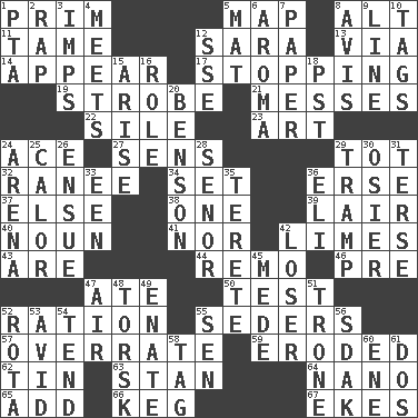ACROSS 1. Demure 5. Atlas unit 8. Keyboard modifier key 11. Not wild 12. "Two Mules for Sister ____" 13. By way of 14. Seem 17. Discontinuing 19. Disco prop 21. Makes clutter 22. Drop; flow; fall 23. Nonscientific branch of learning 24. Adept person 27. Elected reps. 29. Small child 32. Indian princess (variant) 34. Put into a specified state 36. Celtic language 37. Otherwise 38. Single 39. Den 40. Part of speech 41. Or not 42. Citrus fruits 43. "We ___ not amused" (Victoria) 44. San ____ (Riviera town) 46. Before (prefix) 47. Had dinner 50. Trial 52. Food allowance for one day 55. Spring feasts 57. Make much ado about nothing 59. Eaten away 62. Shallow baking pan 63. Comedian Laurel of Laurel & Hardy 64. Billionth: prefix 65. Say or write further 66. Barrel 67. Makes supply last DOWN 1. Parent Teacher Assoc. 2. Strike 3. Naughty children 4. Confronts 5. Floor covering 6. Odor 7. Some stationery 8. Opinion 9. Actor's bit 10. Labels 12. Compass dir. 15. Originate 16. Hero or heavy, e.g. 18. Pacific Standard Time (abbr.) 20. Gillaume's butler role 24. Sports stadium 25. Bodily heat indicating an inflammation 26. Follow as a consequence or result 28. Sir (Sp.) 29. _____ steamer (cargo ship) 30. Flexible twig of a willow tree 31. Laconic 33. Car or cant ending 35. Cigar-shaped 36. Biblical high priest 42. Failure 45. Ancient Persian 47. Wind 48. Cod relative 49. Related on the mother's side 51. Marketplace scale 52. Round or rotation of duties 53. Enthusiastic 54. Be inclined (to) 55. Elected rep. 56. Neighbor of Neb. 58. Label 60. Compass dir. 61. Two (Sp.)