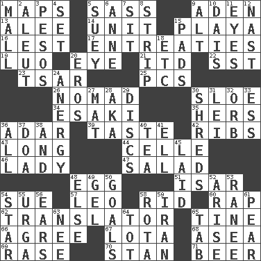 ACROSS 1. Atlas contents 5. Backtalk 9. Arabian gulf 13. Toward shelter 14. A single undivided whole 15. Beach, in Buenos Aires 16. For fear that 17. Pleas 19. Nilotic language 20. Sight organ 21. It would 22. Fast jet (abbr.) 23. Russian ruler of old 25. Personal Computers (abbr.) 26. Wanderer 30. _ gin 34. 1973 Nobel Price Winner (Physics) Leo 35. Possessive pronoun 36. The sixth month of the Jewish calendar 39. Clothes sense 42. Chest bones 43. Protracted 44. Cell (Danish) 46. Kenny Rogers chart-topper in '80 47. First course 48. Ovum 51. Astrian river, tributary to the Danube 54. Take to court 57. Lion 58. To free from 60. Reproach for some lapse or misdeed 62. Interpreter 65. Prong on a fork 66. Match 67. Globular water bottle used in Asia 68. At sea 69. To erase 70. Comedian Laurel of Laurel & Hardy 71. Fermented drink made from hops DOWN 1. Promenade 2. Native American of Southwest Alaska 3. Mexican monetary units 4. Arrange properly for use 5. Chop _ 6. Queen of England 1702-14 7. Be seated 8. Long narrow piece of something 9. Keyboard modifier key 10. Raised platform 11. Sight organs 12. Political cartoonist Thomas 15. Groovy apts. 18. And so on (abbr.) 20. Greek god of love 24. Disorder of the immune system 27. Floor protector 28. Alias (abbr.) 29. Flat circles 30. Tears up 31. Flowery wreath 32. Globe 33. Curvy letter 36. Everything 37. ___ good deed 38. Added to 40. Beverage made from leaves 41. Pipe bend 45. Put down 48. Otherwise 49. Set 50. Finish lines 52. Ascend 53. Indian princess (variant) 54. Play the lead 55. Capital and largest city of Mongolia 56. Hearing organs 58. Roll call or roster of names 59. SW Asia republic 61. Lightbulb-shaped fruit 63. Born 64. Small child 65. Keyboard key