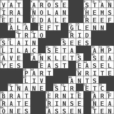 ACROSS 1. Large container 4. Came up 9. Comedian Laurel of Laurel & Hardy 13. Retirement account (abbr.) 14. Pitcher Ryan 15. Is hesitant and indecisive 16. Snakelike fish 17. Peak District village in England 18. Coral ridge 19. In the manner of 21. Bank Draft (abbr.) 22. American astronaut and politician John 24. Musical group of three 26. To free from 27. Killed 29. Observes 30. Pale purple color 31. Bristle 33. Electrical Unit 36. "___ Maria" 37. Short socks 40. Ocean 41. Consenting reply 42. Compass direction 43. Artist's stand 45. Piece 47. Compose 48. 54 in ancient Rome 49. Pismires 50. Empty; void 52. Title for a knight 54. And so on (abbr.) 56. Naughty child 57. Bert's buddy 59. Sandy's bark 61. Assign a rank or rating to 62. Remove soap 63. Teachers' org. 64. Singles 65. NE Netherlands city 66. "___ Little Indians" DOWN 1. Compete 2. Type of rug 3. Baron Munchausen's specialties 4. A saturated hydrocarbon 5. Cowboy competition 6. Norwegian king 7. Table seasoning 8. Compass dir. 9. Tears up 10. Adolescent 11. So be it 12. Science/research agcy. 20. Operatic vocal solo 22. Relatively large 23. Untruth 25. South American Indian 27. Kill 28. Moving, as bait 29. Proofreading order 31. Three-handed card game 32. Raised railways 33. Helper 34. Confront 35. Diluted with white 38. Effrontery 39. Stitched 44. Johnson of "Laugh-In" 45. Food holders 46. The 18th letter of the Arabic alphabet 49. Get up 50. SW Asia republic 51. Nathan's nickname 52. Indian titles of respect 53. Lodging establishments 55. Algonquian 56. Sis' sibling 57. Period 58. Car or cant ending 60. Air blower