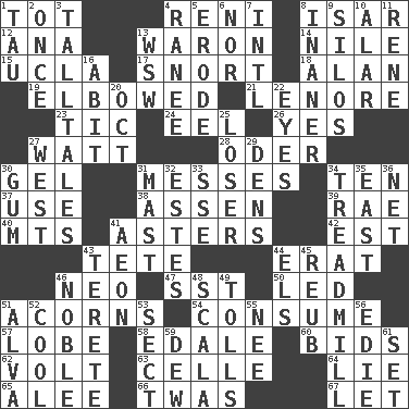 ACROSS 1. Small child 4. Painter Guido (1575-1642) 8. Astrian river, tributary to the Danube 12. Santa ___, CA 13. Make _____ (do battle with) 14. "Death on the ____" 15. Southern CA. univ. 17. Derisive sound 18. Actor Alda or Thicke 19. Turned at an angle; bent 21. Poe poem 23. Nervous spasm 24. Snakelike fish 26. Affirmative reply 27. Electrical Unit 28. Baltic tributary 30. Set 31. Makes clutter 34. "___ Little Indians" 37. Purpose 38. NE Netherlands city 39. Actress Charlotte 40. Mountains (abbr.) 41. Michaelmas daisies 42. Eastern Standard Time (abbr.) 43. False hair 44. Part of Q.E.F. 46. Modern: prefix 47. Fast jet (abbr.) 50. Directed 51. Oak nuts 54. Eat 57. Ear part 58. Peak District village in England 60. Auction offers 62. Electrical Unit 63. Cell (Danish) 64. Falsehood 65. Toward shelter 66. It was, poetically 67. Allow DOWN 1. The 19th letter of the Greek alphabet 2. At one time in the past 3. Baron Munchausen's specialties 4. Indian princess (variant) 5. Eat (away) 6. And not 7. International (abbr.) 8. More lacking in sense or substance 9. Grain storage towers 10. Having or resembling wings 11. French philosopher Descartes 13. Compass dir. 16. "This won't hurt ____!" 20. Sep. follower 22. Sight organs 25. Failure 27. Compass direction 29. Lairs 30. Chewing product 31. Vertical spar for supporting sails 32. _____ Park, CO 33. Compass dir. 34. Excercise machine 35. Compass direction 36. Fish or hair follower 41. Age 43. Cylindrical with tapered ends 44. Raised railways 45. Reuben's nickname 46. Having high moral qualities 48. Any of the three canals of the cochlea 49. For Whom the Bell _____ 51. Inventor's middle name 52. Calm and collected 53. Religious group 55. Born 56. Singer Brickell 59. Morning condensation 61. Arrange properly for use