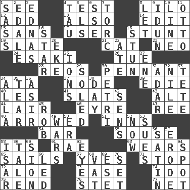 ACROSS 1. Perceive with the eye 4. Trial 8. _ and Stitch 12. Say or write further 13. In addition 14. Prepare for publication 15. Without 17. One who uses or employs something 18. Check the growth or development of 19. Chalkboard 21. Feline 23. Modern: prefix 24. 1973 Nobel Price Winner (Physics) Leo 26. Third day of the wk. 28. Vintage cars 30. Pre-World Series prize 34. "One Day ___ Time" 37. Connecting point 39. Singer Brickell 40. French article 41. Narrow boards 43. The first octave above the treble staff 44. Den 46. Jane of fiction 47. To riddle 48. Moved like an arrow 51. Taverns 54. Soap unit 55. Boozer 58. ___ a Wonderful Life 61. Actress Charlotte 63. Erodes 65. Moves on water 67. Jacques Cousteau's middle name 71. Halt 72. Medicinal plant 73. Relaxation 74. Wedding promise 75. Tear apart 76. Proofreading order 77. Fish or hair follower DOWN 1. Backtalk 2. Peak District village in England 3. Ferber et al. 4. The 19th letter of the Greek alphabet 5. Raised railways 6. Compass dir. 7. Torque (variant) 8. Allow 9. Goddess of spring and wife of Bragi 10. Actor's bit 11. "Beetle Bailey" pooch 16. Play the lead 18. Make senseless or dizzy 20. Make supply last 22. Had dinner 25. Charged atoms 27. Compass dir. 29. Having a sole or soles 30. _ dish (used to culture cells) 31. The sixth month of the Jewish calendar 32. "Death on the ____" 33. Wig 34. Silent film actress Nazimova 35. Lacerate 36. SW Saudi Arabia district 38. 24 hours 42. Elected reps. 45. Director Reiner 49. Armed conflicts 50. Epoch 52. At this time 53. Takes to court 56. Smooth fabric 57. Eat (away) 58. Astrian river, tributary to the Danube 59. Story 60. The Jewish people; Israel 62. Snake ____ (dice throw) 64. Specific locale 66. Directed 68. Large container 69. Compass dir. 70. Put into a specified state