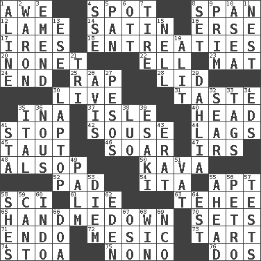 ACROSS 1. Deep reverence 4. Specific locale 8. Connect, as a bridge 12. Unable to walk 14. Smooth fabric 16. Celtic language 17. Angers 18. Pleas 20. Music written for nine 22. Pipe bend 23. Floor covering 24. Conclusion 25. Reproach for some lapse or misdeed 28. Flaplike covering 30. Moving, as bait 31. Clothes sense 35. _ tizzy (2 wds.) 37. Small island 40. Froth on beer 41. Halt 42. Lush 44. Straggles 45. Drawn tight 46. Fly high 47. Big collection agency 48. Columnist Joseph or Stewart 50. Polynesian shrub of the pepper family 52. Groovy apt. 54. Call ___ day 55. Fitting 58. _-fi 61. Whopper 63. Giggle 65. Sleeping bag shop? 70. Arranges properly for use 71. Inside; within (prefix) 72. Mesonic 73. Small pie 74. Portico 75. Words to Nanette 76. Two (Sp.) DOWN 1. Place in a line 2. Make _____ (do battle with) 3. Make improvements or corrections to 4. Compass dir. 5. Baking dish 6. Baseball player Mel 7. Hoop that covers a wheel 8. Put into a specified state 9. Demure 10. Toward the sea 11. Egg locale 13. Compass dir. 15. 1994 drama film starring Jodie Foster 19. Set down 21. Three (prefix) 26. Opinion 27. Mexican monetary units 29. Mexican or Central American flower 30. Portable computer 32. Scorch 33. Labels 34. Begley and Asner 35. Slanted text style (abbr.) 36. Horse sense 38. Nilotic language 39. 1973 Nobel Price Winner (Physics) Leo 41. R.R. building 43. Part of Q.E.F. 49. Inside of hand 51. Large container 53. South Vietnam president (1954) 55. Forward in time 56. Stone: prefix 57. Trials 58. "______ My Girl" (Turtles hit) 59. Patter 60. _ china 62. Locale of original sin 64. Eastern Standard Time (abbr.) 66. ___ good deed 67. Bear (Spanish) 68. Victory 69. Non-commissioned officer (abbr.)